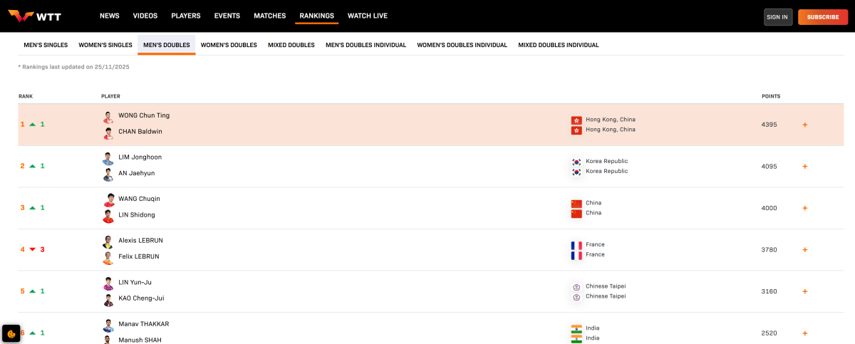 香港乒乓球男雙組合黃鎮廷/陳顥樺自去年10月開始合作以來銳不可擋。今年4月他們在WTT太原站挑戰賽勇奪亞軍,乘勇續戰WTT球星挑戰賽盧比安納站,首圈爆冷淘汰應屆世錦賽金牌得主、日本組合篠塚大登/戶上隼輔,晉身四強並取得季軍,當時世界排名升上第13位。