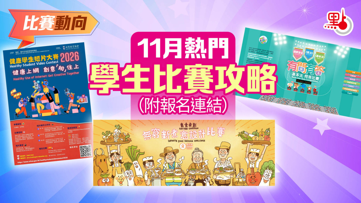 【點教育報道】想在短片創作中一展才華?還是想挑戰誰對基本法了解最透徹?抑或用愛設計一款關懷社區的午膳套餐?11月有多項專為學生而設的比賽等你參加,立即把握機會,為自己的課外活動履歷添上亮麗一筆!