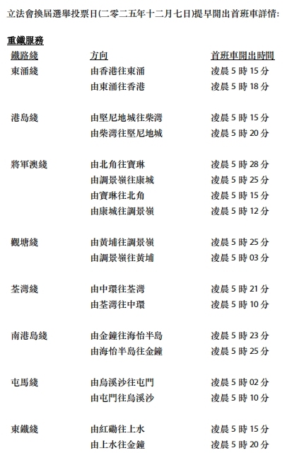 因應選舉事務處延長投票時間的安排,港鐵將於12月7日早上提早開出頭班車,大部分綫路將於早上約5時至5時30分開出,以便利票站人員前往票站,為早上7時30分開放投票作好準備。