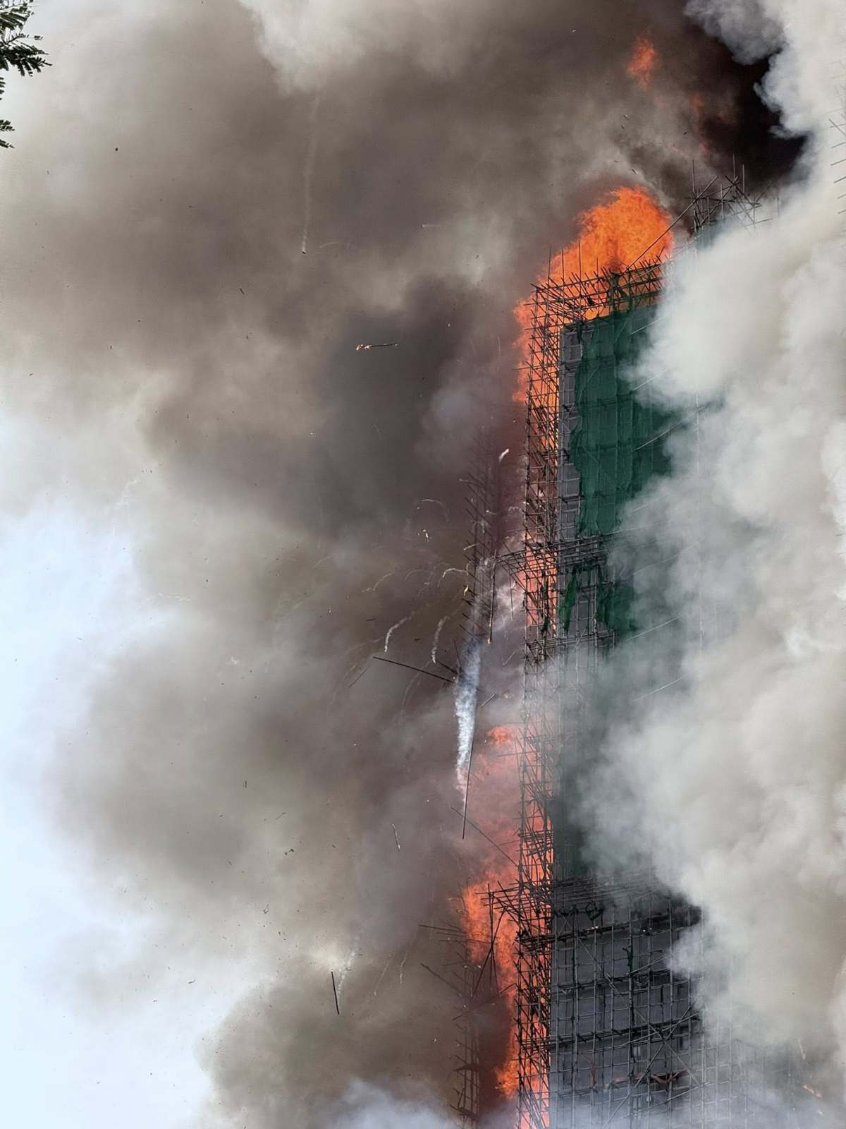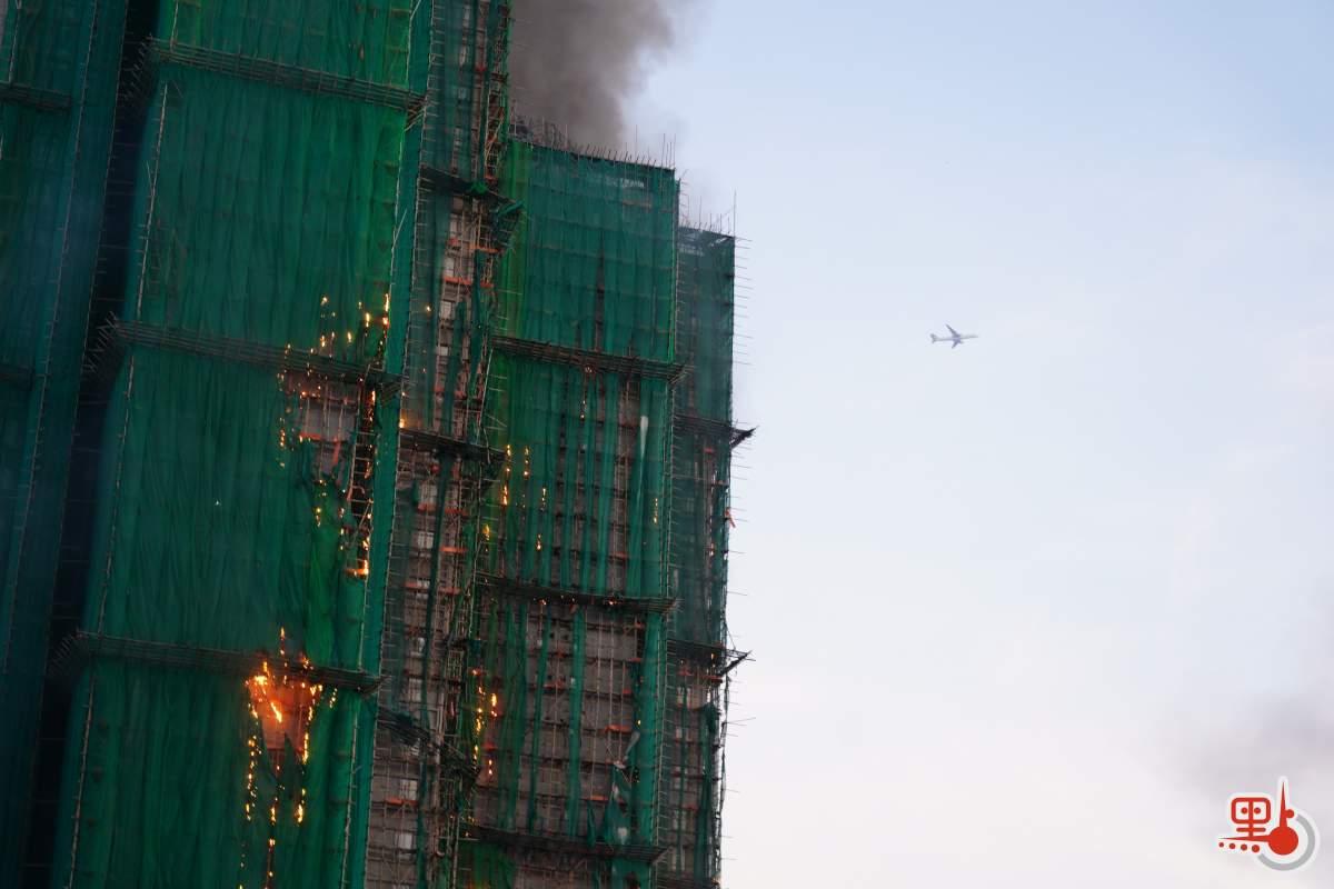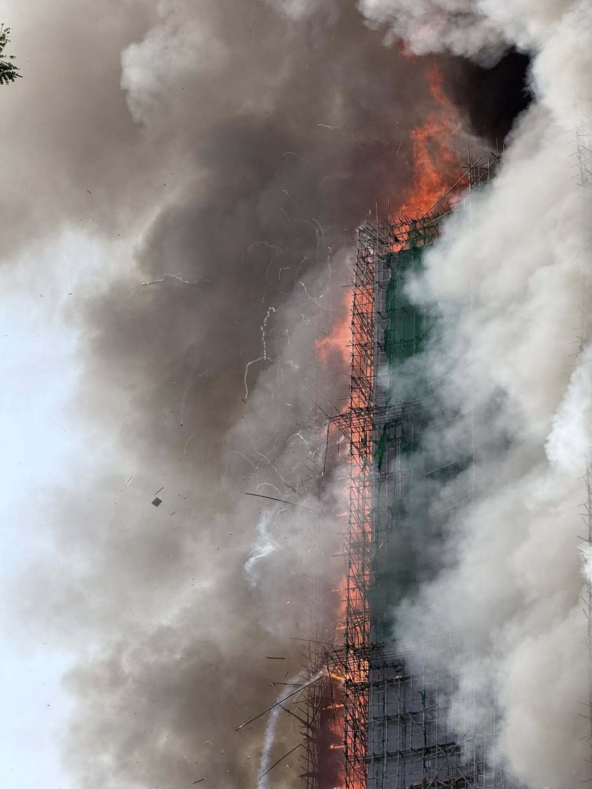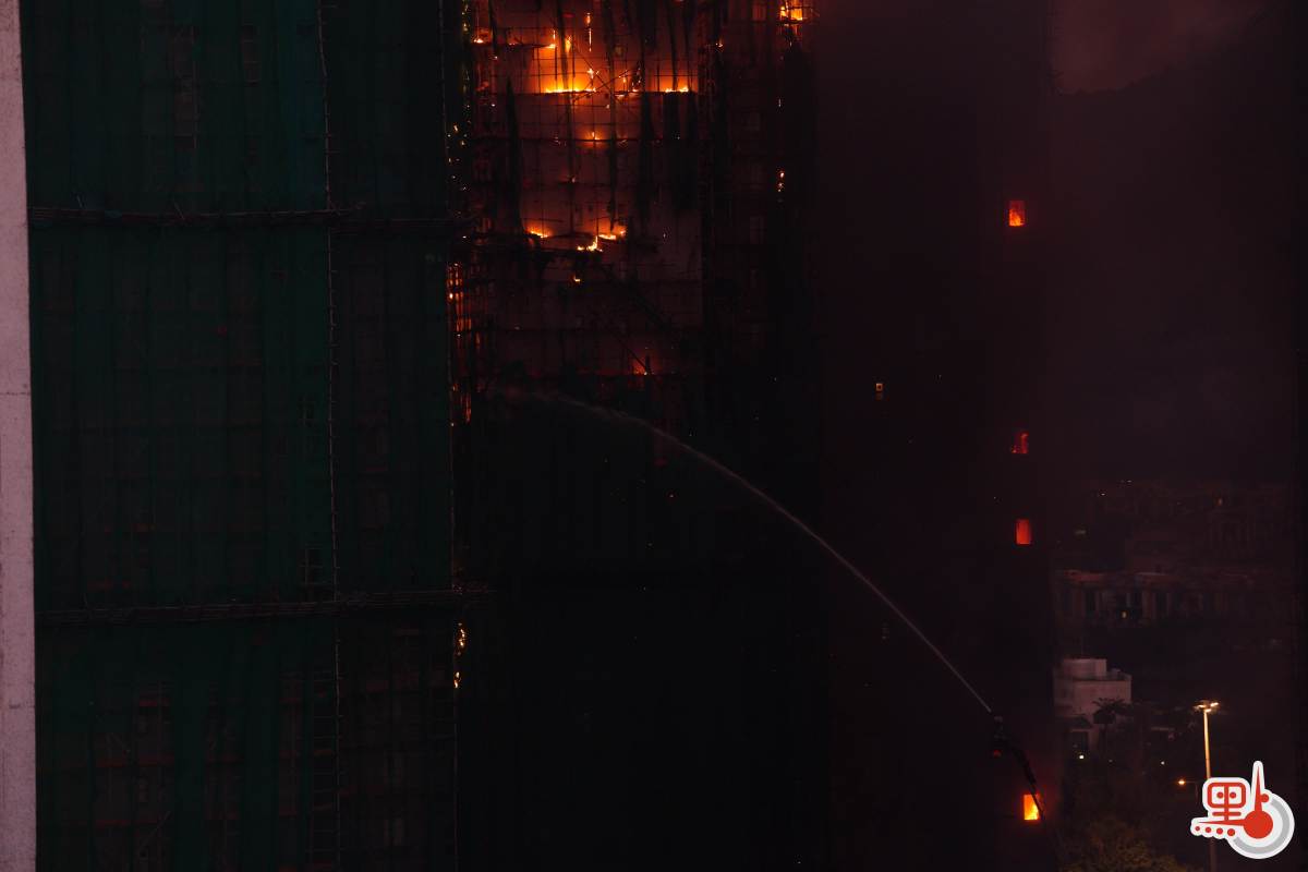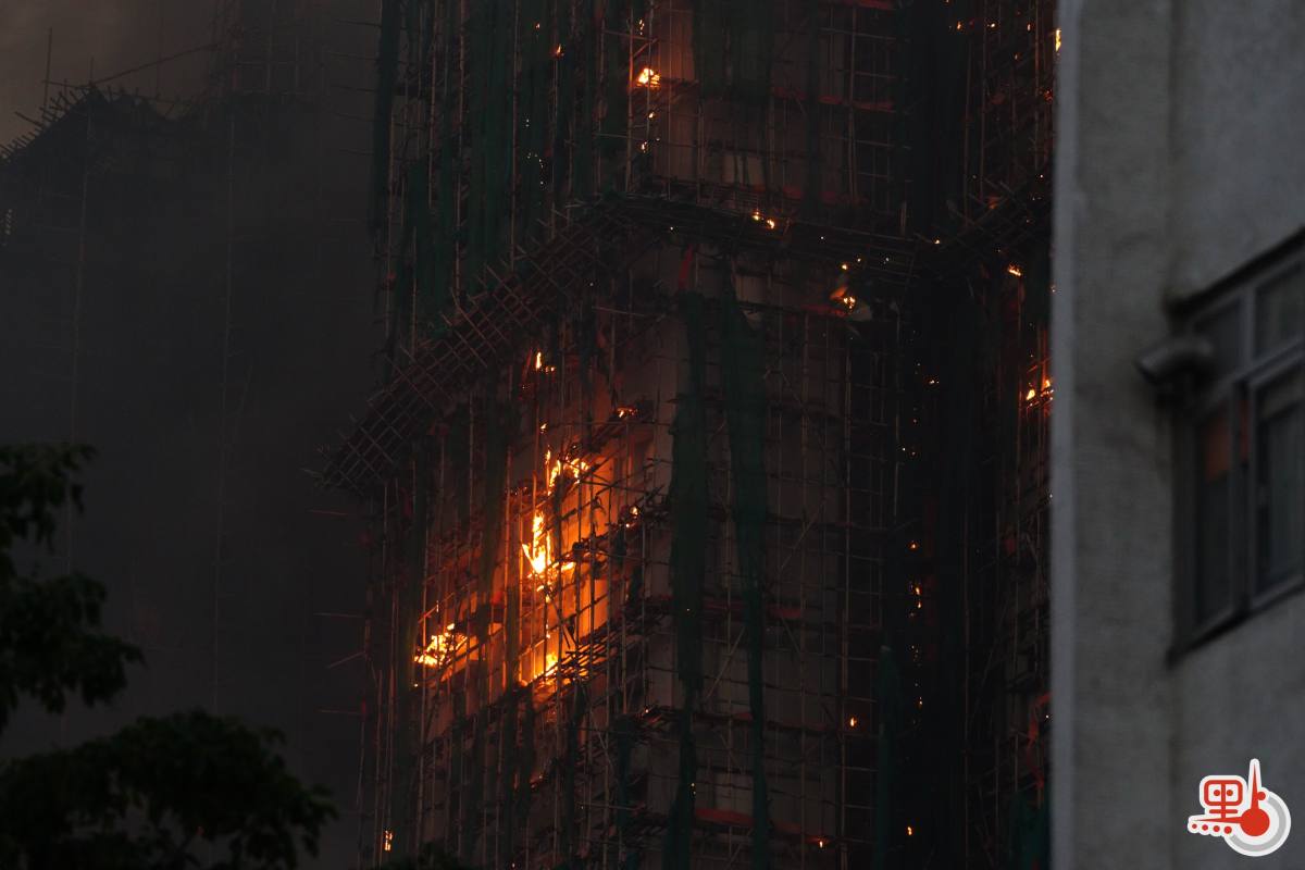 【18:30】入夜後火勢越來越大,有大廈火光沖至數十米高,周圍不斷有帶火星的燃燒灰燼掉落,不時還有爆破聲。