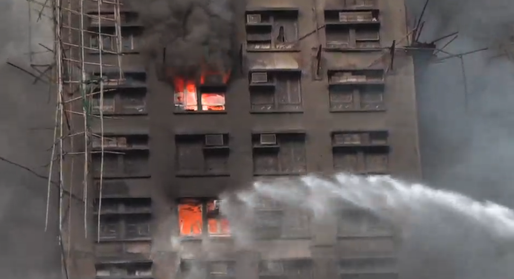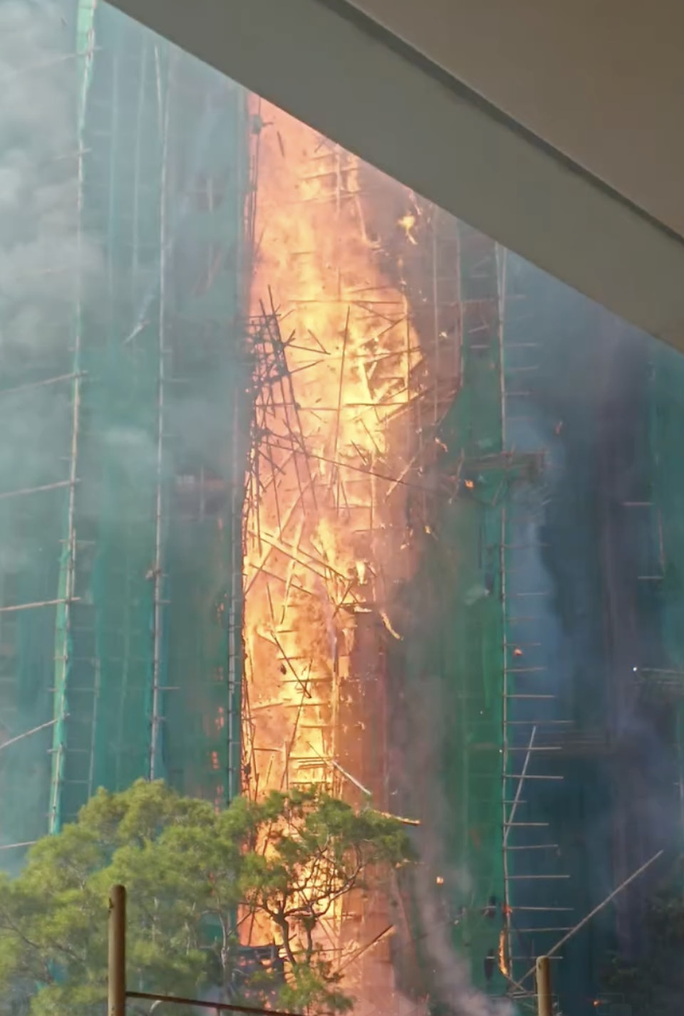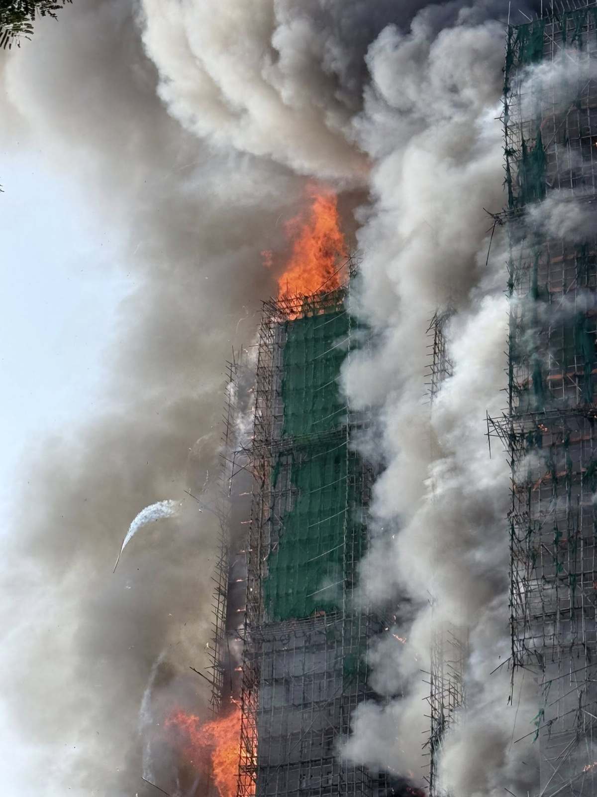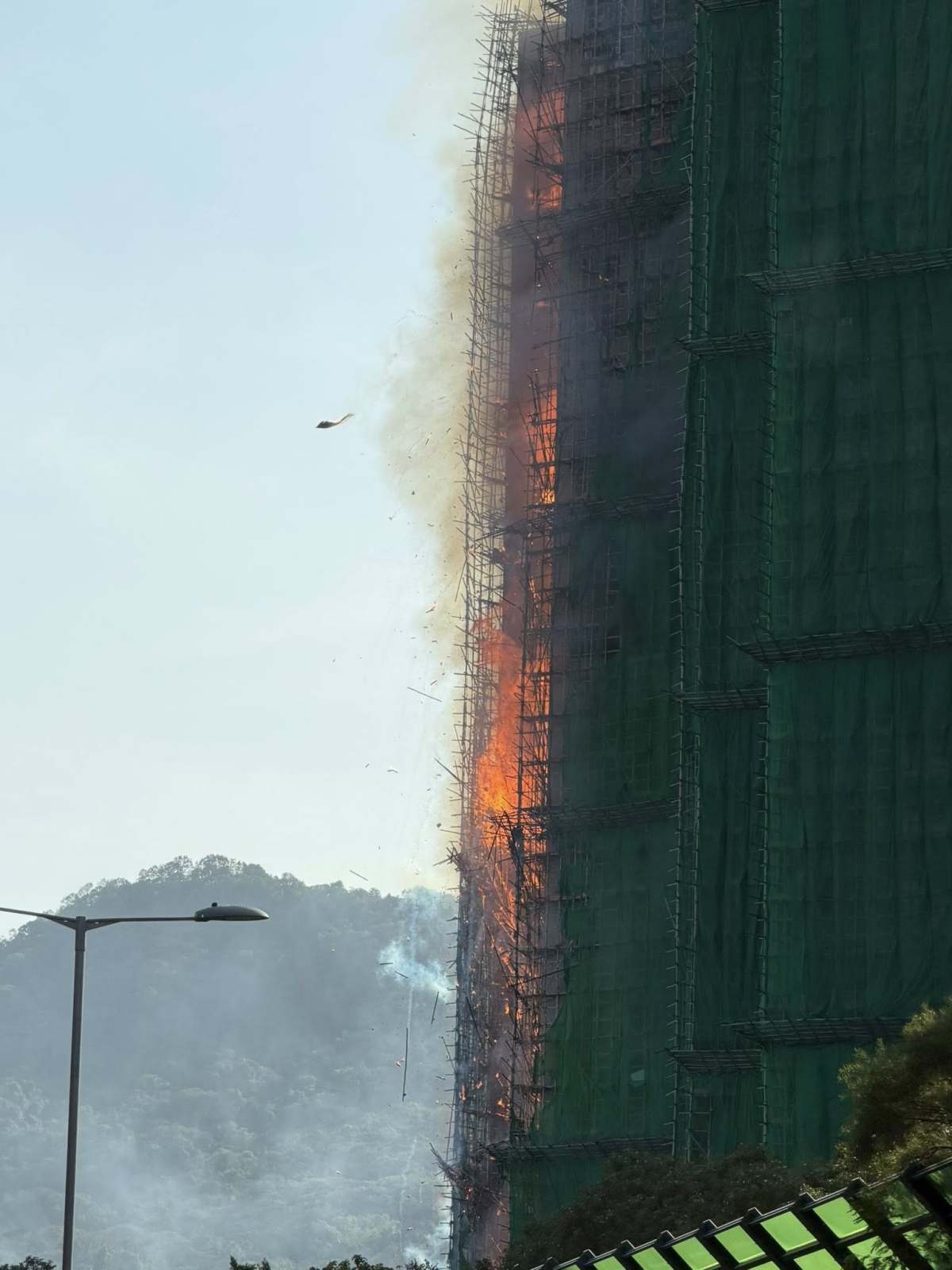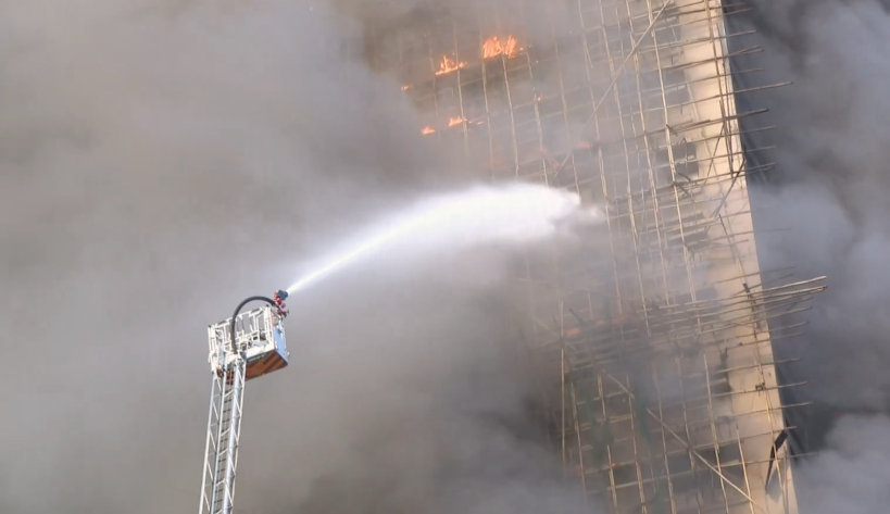 【18:30】入夜後火勢越來越大,有大廈火光沖至數十米高,周圍不斷有帶火星的燃燒灰燼掉落,不時還有爆破聲。