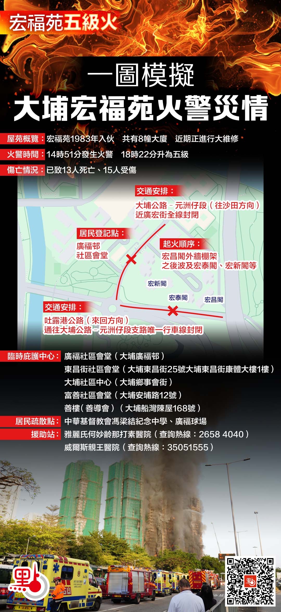 【點新聞報道】大埔宏福苑今日(26日)下午2時51分發生火警,火勢猛烈,下午3時02分升為三級,下午3時34分升為四級,並於下午6時22分升為五級。消防人員正進行滅火行動,火勢仍未熄滅。最新消息指,大埔宏福苑五級火已造成13人死亡、15人受傷。點新聞梳理最新火情,製作大埔宏福苑五級火地圖,一圖睇清火警受影響範圍、交通安排、居民疏散點等信息。