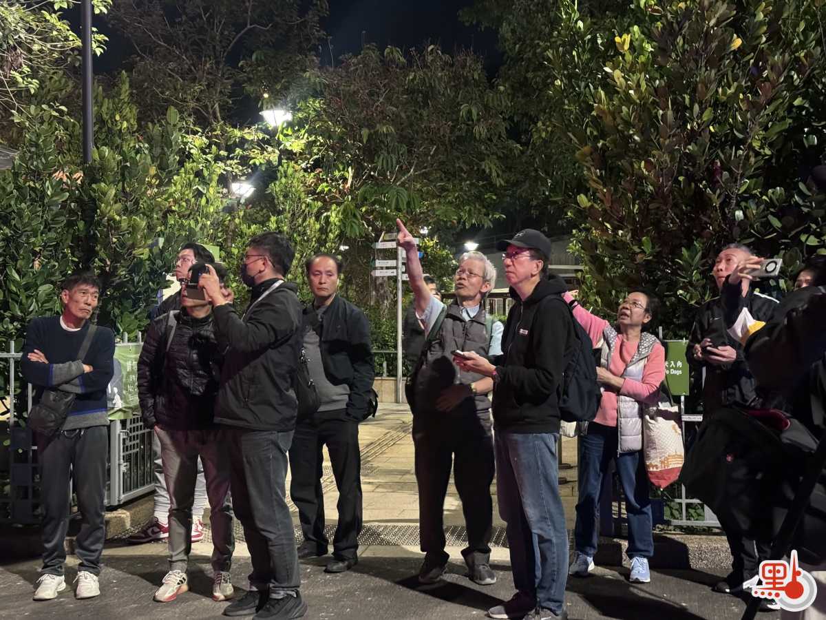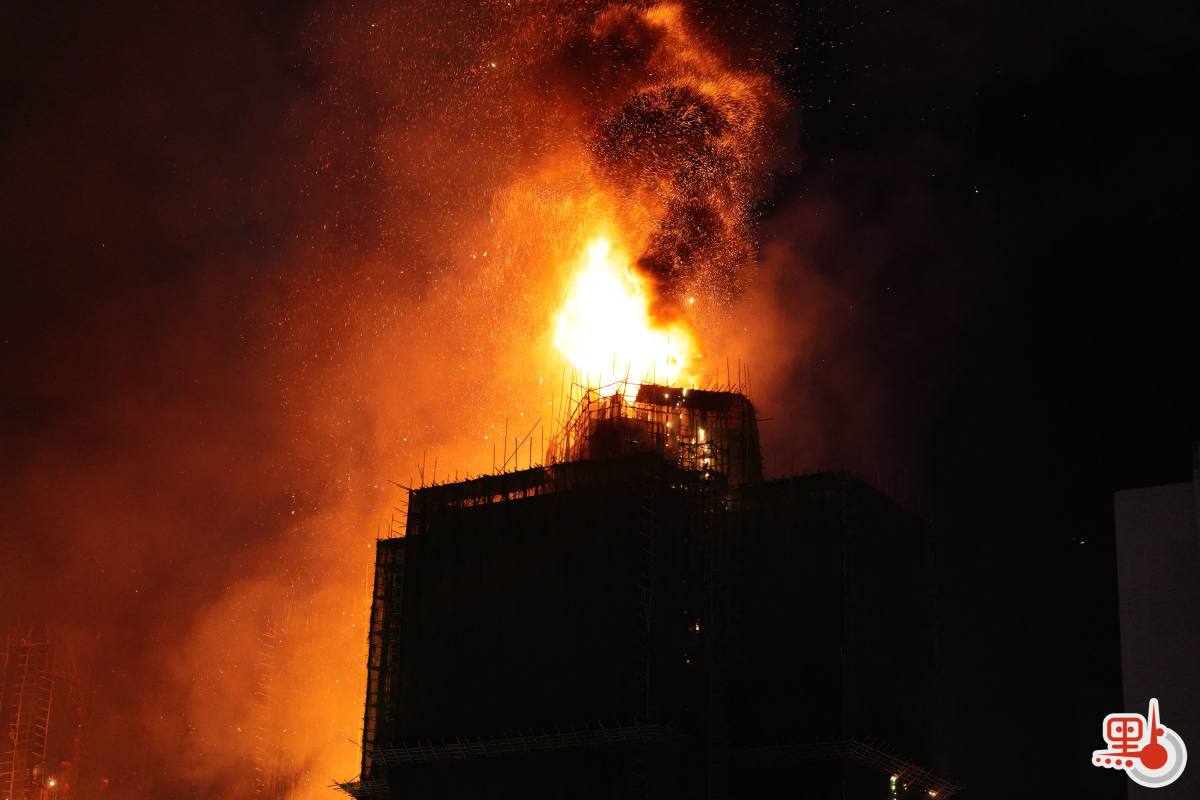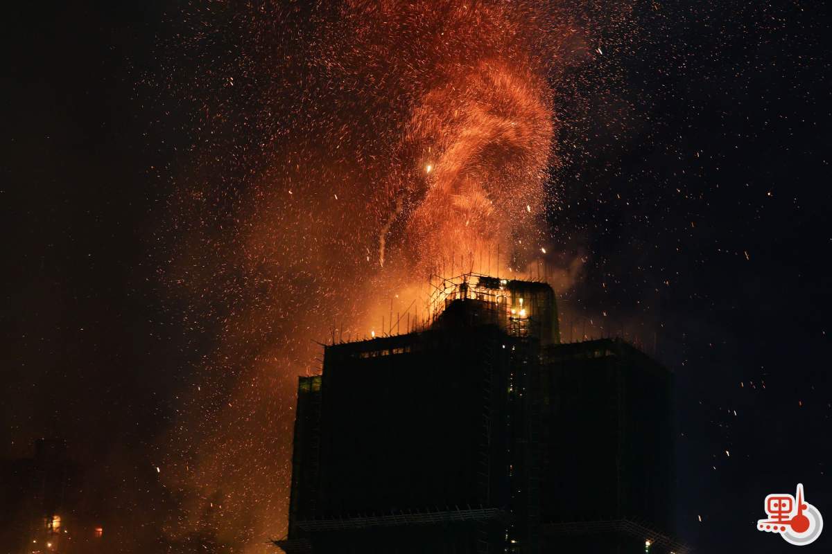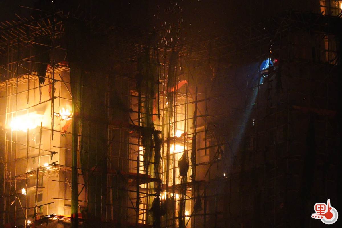 點新聞記者在現場看到,入夜後,火勢有突然擴大的跡象,火光沖至數十米高,周圍不斷有帶火星的燃燒灰燼掉落,不時還有爆破聲,宏志閣亦受火舌波及。整個屋苑有8座,其中7座已起火。