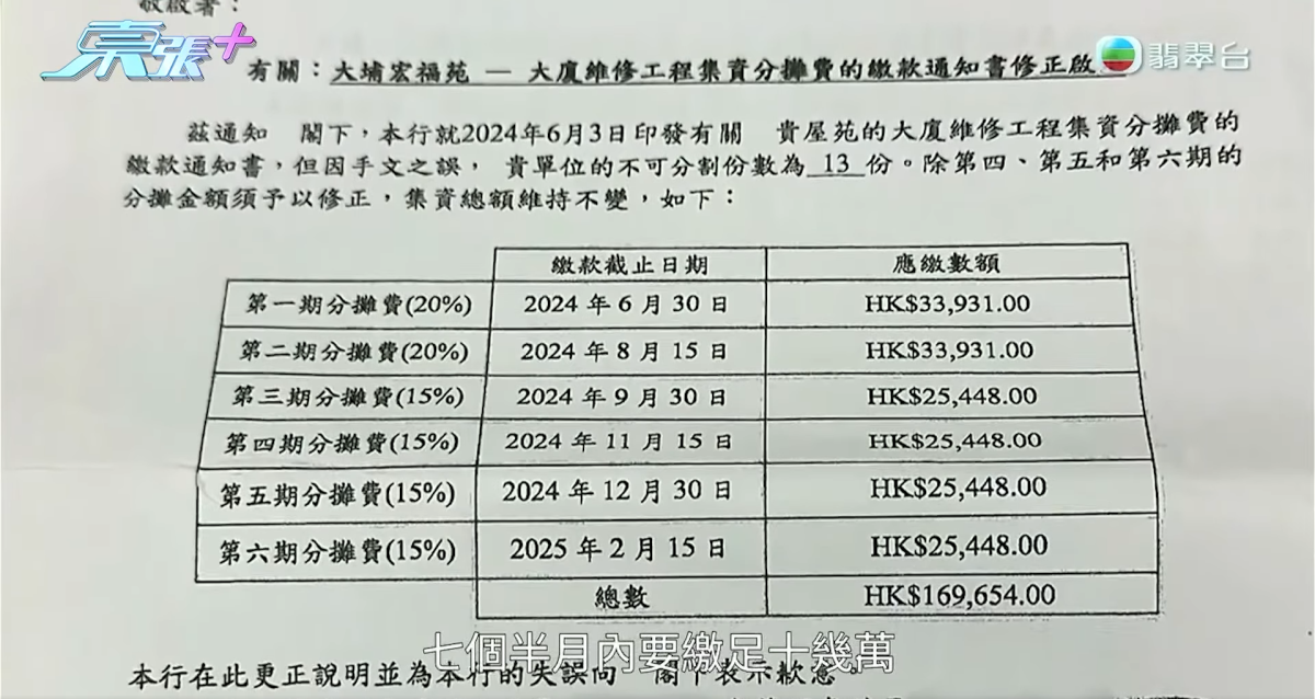 宏福苑在2016年強制驗樓後表示要大維修,當時按程序招標尋找工程承辦商,住戶在2024年6月3日突然間收到繳款通知書,集資金額3.3億港元,由8座共1984戶攤分,每戶要夾16至18萬,而住戶在六個半月內需繳付全數。街坊表示很徬徨,擔心需要「承擔遲交或欠交大廈維修工程分攤費用而引致法團損失之一切責任或費用」。