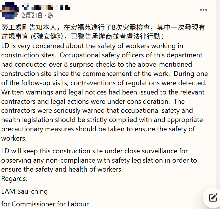 實際上,10月中環華懋大廈發生三級火後,屋宇署曾向所有認可建築專業人士及註冊承建商發出通告,要求立即檢視建築物外牆使用的保護網、保護幕及防水油布等材料的阻燃性能,以防範工地火災風險。