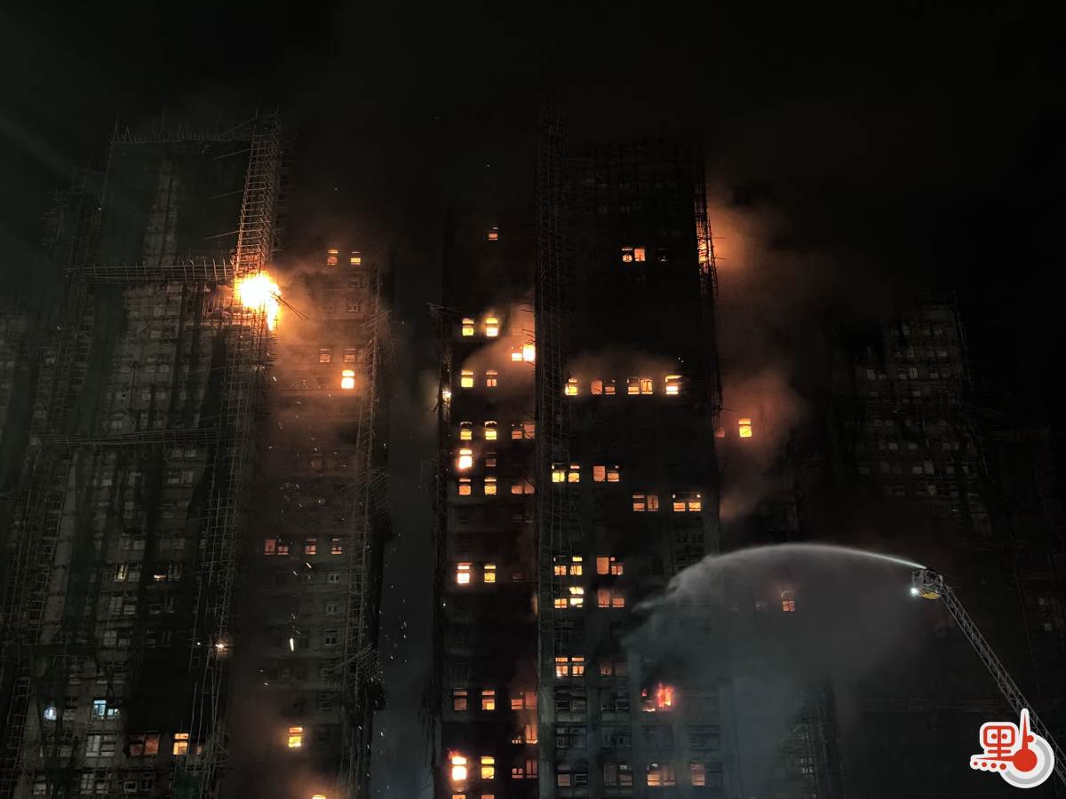 【點新聞報道】大埔宏福苑今日(26日)下午發生五級火警。晚上11時之後,現場火勢仍然猛烈,並不時有爆破聲,其中一座大樓的外部棚架火勢增強。
