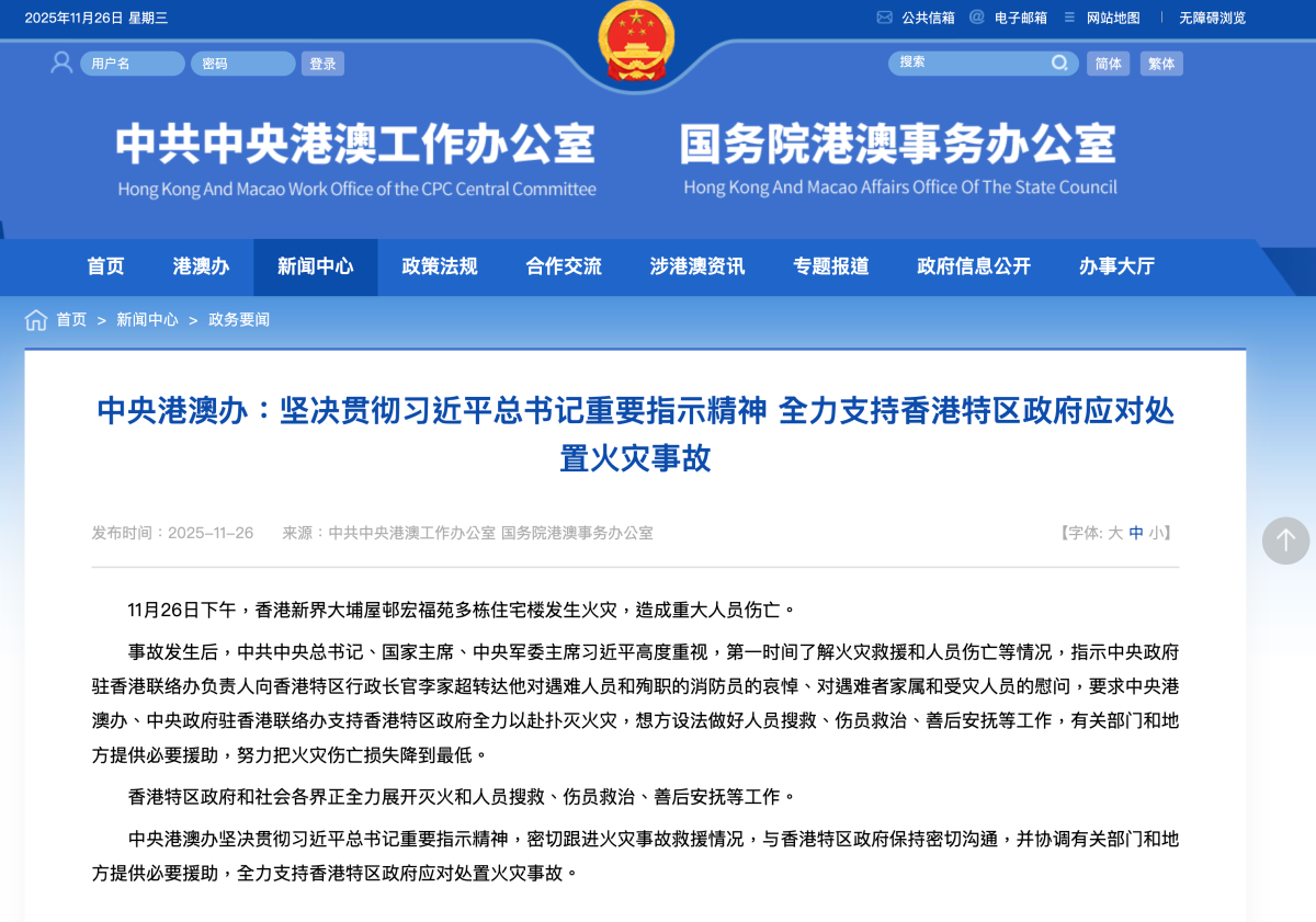 中央港澳辦表示,堅決貫徹習近平總書記重要指示精神,密切跟進火災事故救援情況,與香港特區政府保持密切溝通,並協調有關部門和地方提供必要援助,全力支持香港特區政府應對處置火災事故。