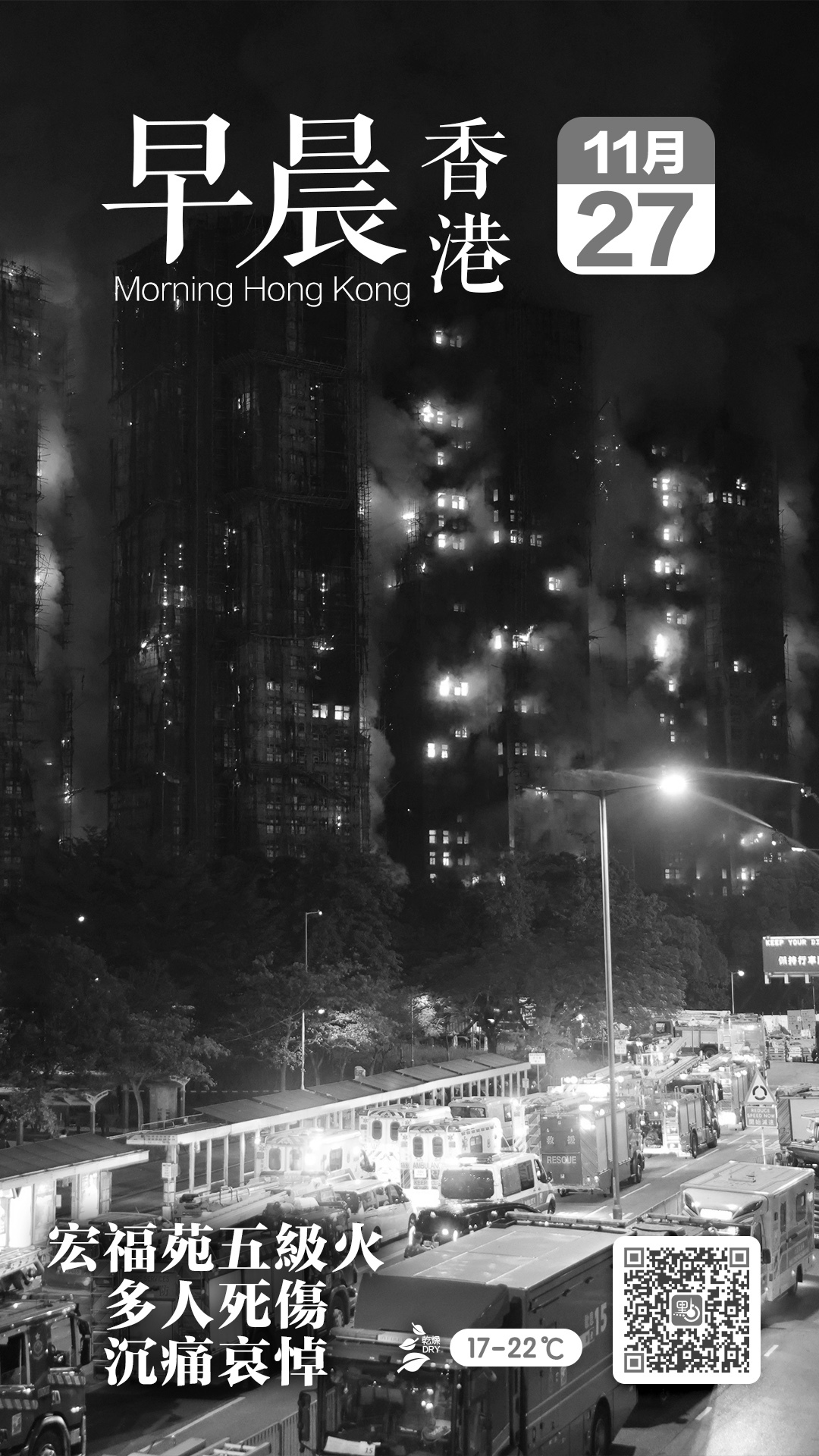 【點新聞報道】大埔宏福苑昨日(26日)下午2時51分突發火警,火勢迅速蔓延,下午3時02分升為三級,下午3時34分升為四級,並於下午6時22分升為五級。據警方及消防人員早前見記者時交代,火警已造成至少44死逾200人失聯,另外,工程公司3名負責人涉誤殺被捕。