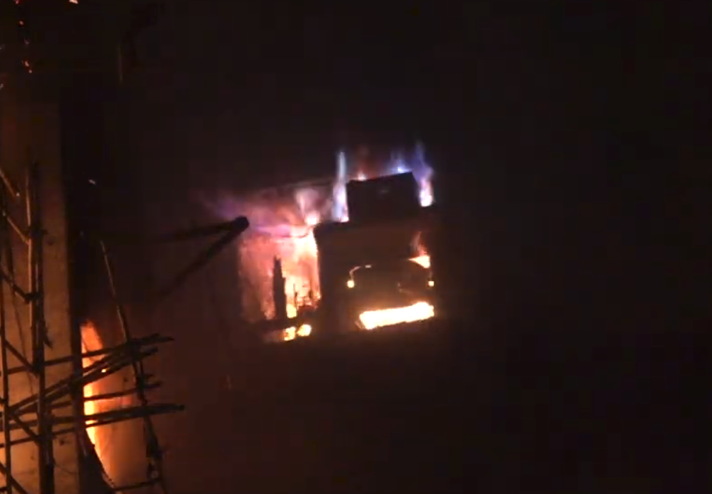 【23:30】現場火勢凶猛,有大廈不斷噴出掉落被燒毀的碎片。有單位窗口冒出藍色火焰。