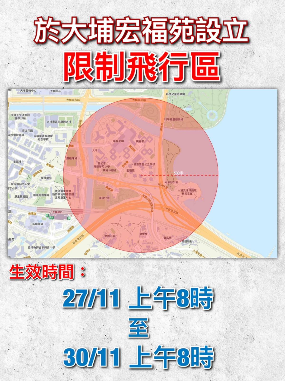 【點新聞報道】警方今日(27日)在社交平台發文表示,就大埔宏福苑發生的五級火警,為保障公眾安全及確保救援工作進行,警務處將於該範圍設立「限制飛行區」。時間為2025年11月27日上午8時至2025年11月30日上午8時。