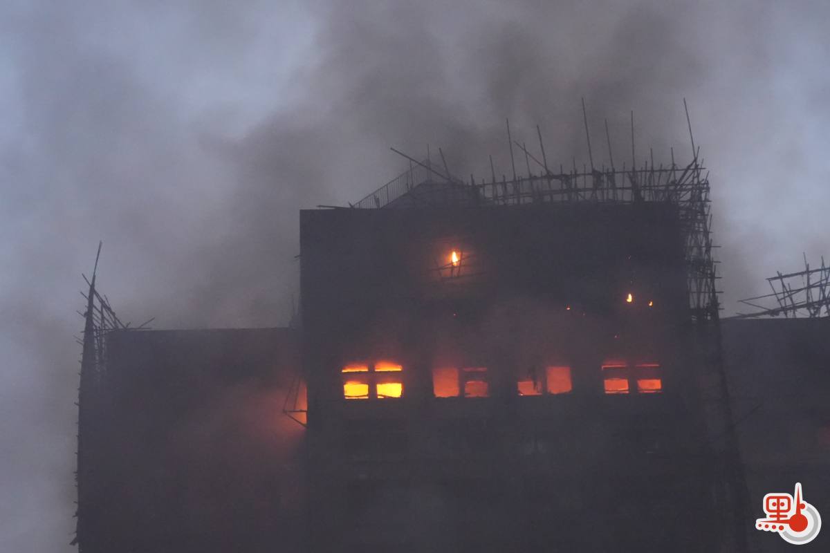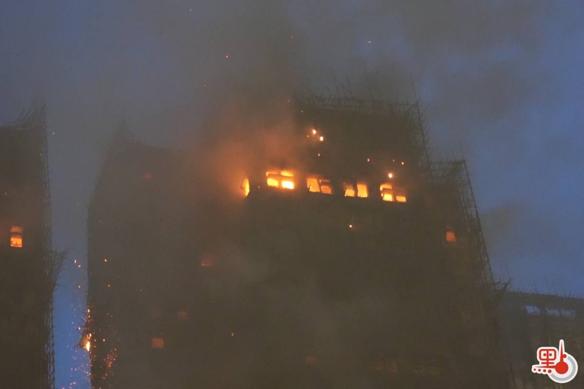 其中,宏道閣、宏泰閣兩座棚架幾乎燒完,高層仍有明顯火星。宏道閣目前高層數下第三層內部有明顯火苗,中層右側有明顯火苗,建築外牆已經燒黑,窗體全部損壞嚴重。宏泰閣高層左側火勢更為明顯(靠近宏道閣那側),火苗衝出窗戶,未有熄滅跡象。宏道閣左側棚架完整,牆體未有非常明顯的燒黑痕跡,宏泰閣右側同樣。但靠近中間部分,包括宏道閣全部、宏泰閣左側燒黑痕跡明顯,窗戶玻璃已爆裂,窗口冷氣機燒剩骨架。