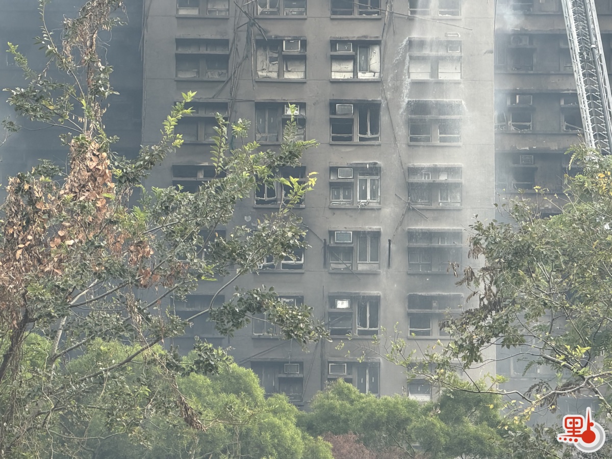 截至今日(27日)上午7時許,點新聞記者現場所見,最先起火的宏昌閣外牆全部被燒黑,肉眼可見中層仍有火星,消防水喉仍在對準中層進行撲救。相比底層,宏昌閣中高層窗體損壞嚴重,只剩窗架,高層外牆呈漆黑,不斷有濃煙冒出。
