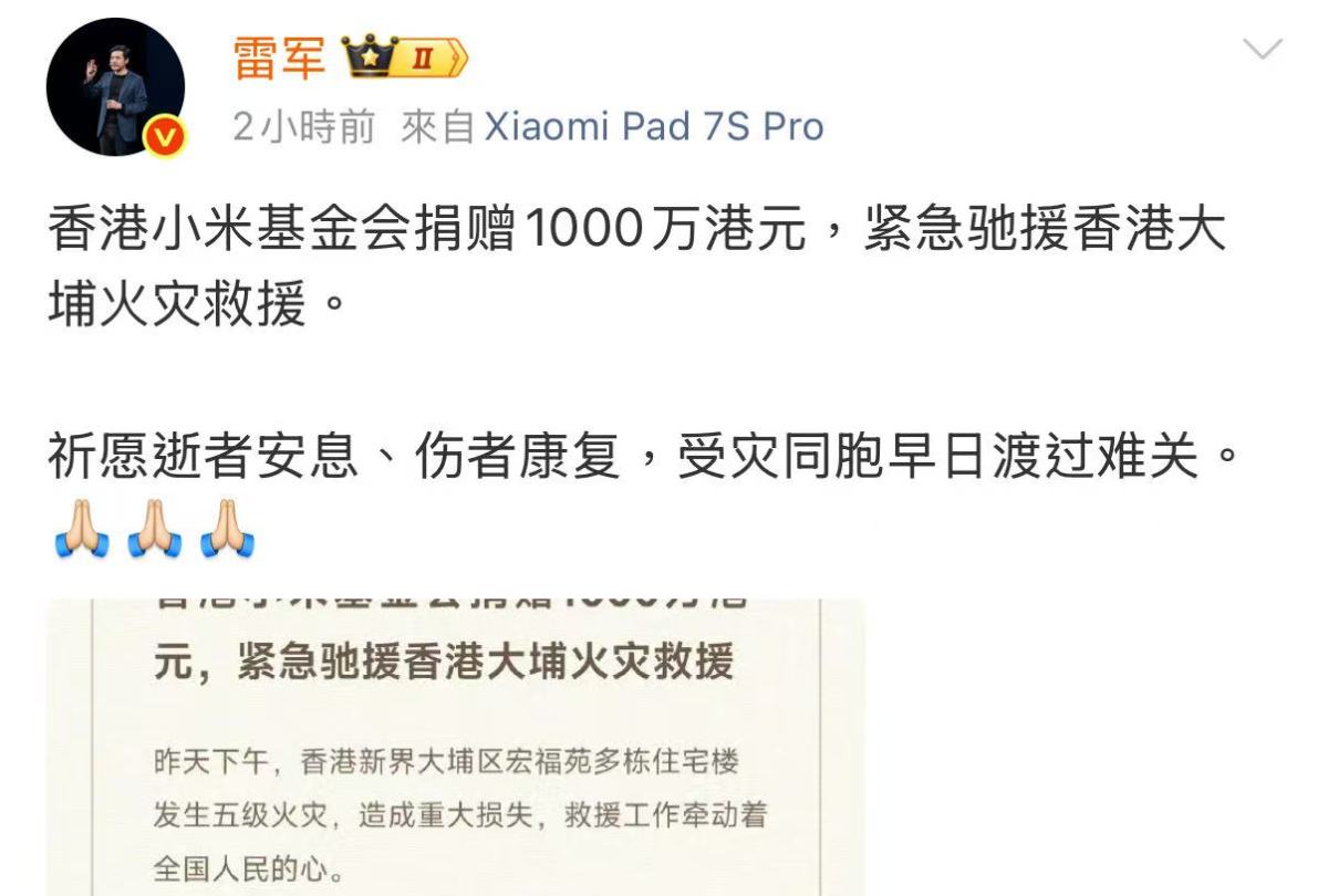 【點新聞報道】小米(01810)創始人雷軍今日(27日)於社交媒體發文表示,香港小米基金會捐贈1,000萬元,緊急馳援大埔火災救援。