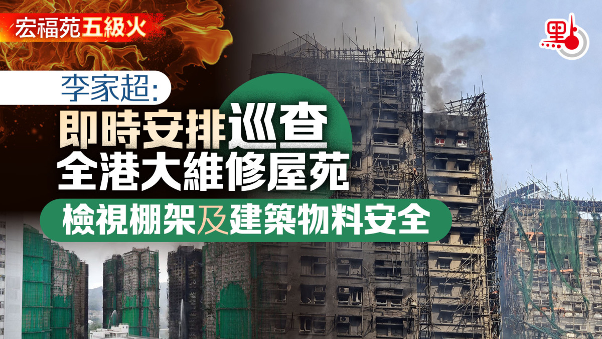 李家超強調,政府將繼續全力撲滅火災、救援被困居民及治理傷者,同時全力展開善後支援,為死者家屬、傷者及受影響居民提供援助。政府會全力為受影響家庭提供臨時住宿,並已安排足夠社工,為各個受影響家庭及有需要人士提供適切支援,並會盡快安排提供財政援助,跟進相關善後安排。另外,政府已即時安排巡查全港所有正在進行大型維修的屋苑,檢視棚架及建築物料的安全。