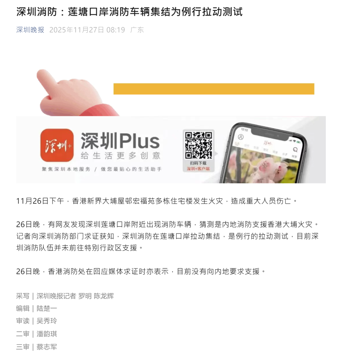 昨晚,有網友發現深圳蓮塘口岸附近出現消防車輛,猜測是內地消防支援香港大埔五級火。據深圳晚報報道,經向深圳消防部門求證後獲知,深圳消防在蓮塘口岸拉動集結,是例行的拉動測試,目前深圳消防隊伍並未前往香港特區支援。