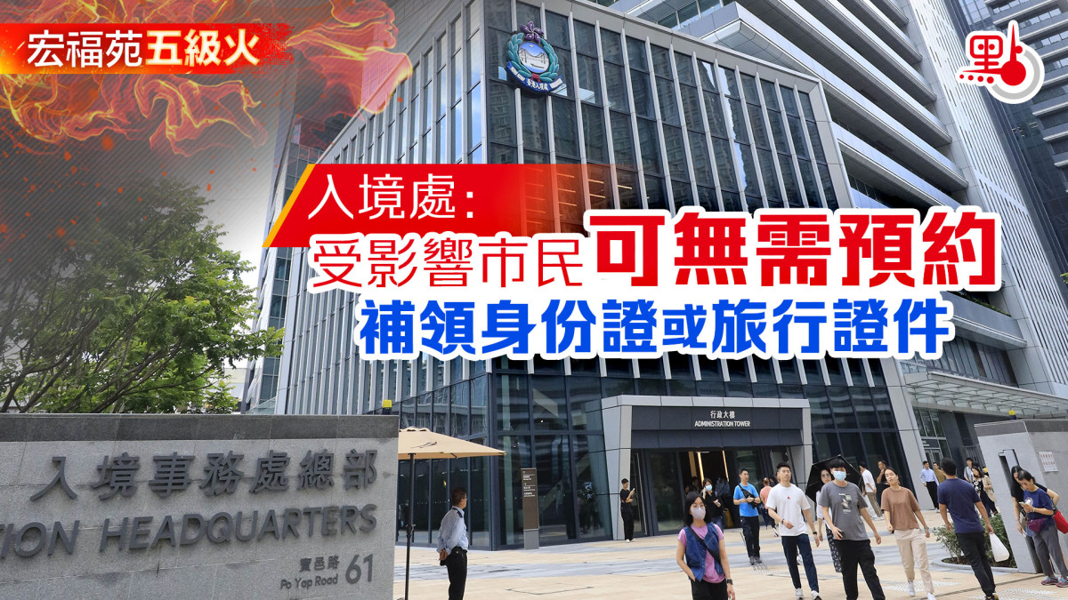 【點新聞報道】大埔宏福苑發生致命五級火,火警至今造成44死,279人仍失聯;火勢仍未救熄。入境事務處今日(27日)宣布,受大埔宏福苑火警影響的市民如需補領香港身份證,可在辦公時間內前往任何一間人事登記辦事處辦理申請,無需預約。