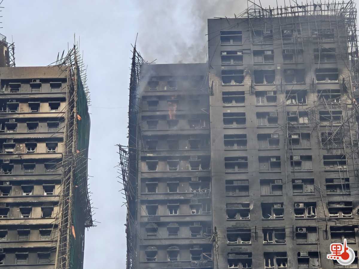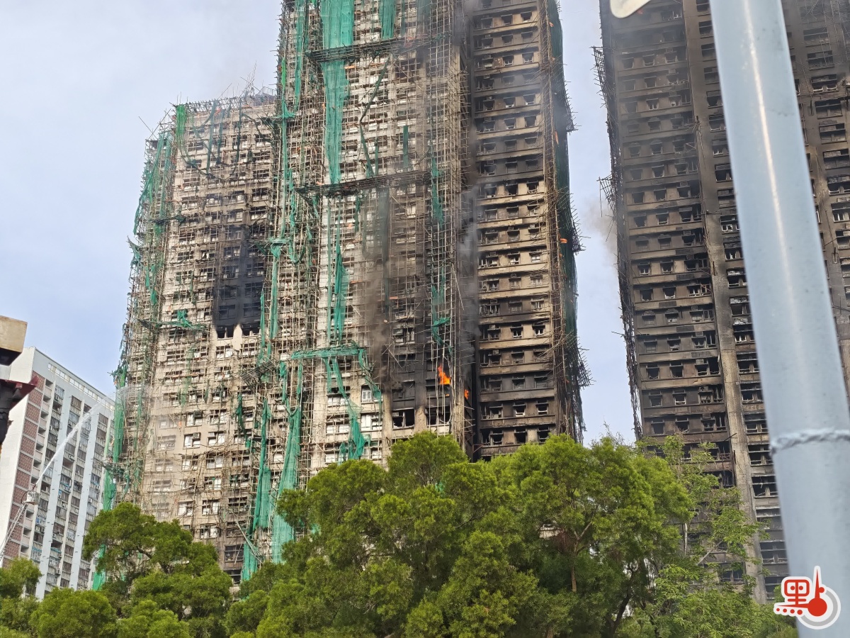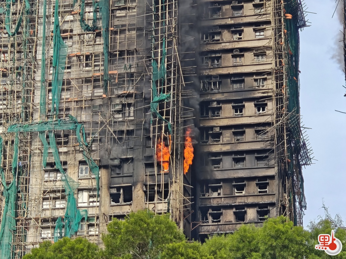 【點新聞報道】大埔宏福苑昨日(26日)發生五級火警,造成多人傷亡,消防人員仍在進行滅火行動。事故已增至55人遇難;傷者中有45人情況嚴重,亦有7名消防人員受傷。今日(27日)下午3時左右,點新聞記者在火災現場見到,火勢還未完全撲滅,原本未見有明顯火跡的宏道閣中部窗口突然冒出火焰,並且火勢有越來越大的趨勢,在燃燒途中記者不時聽到疑似內部傳來的爆裂聲。