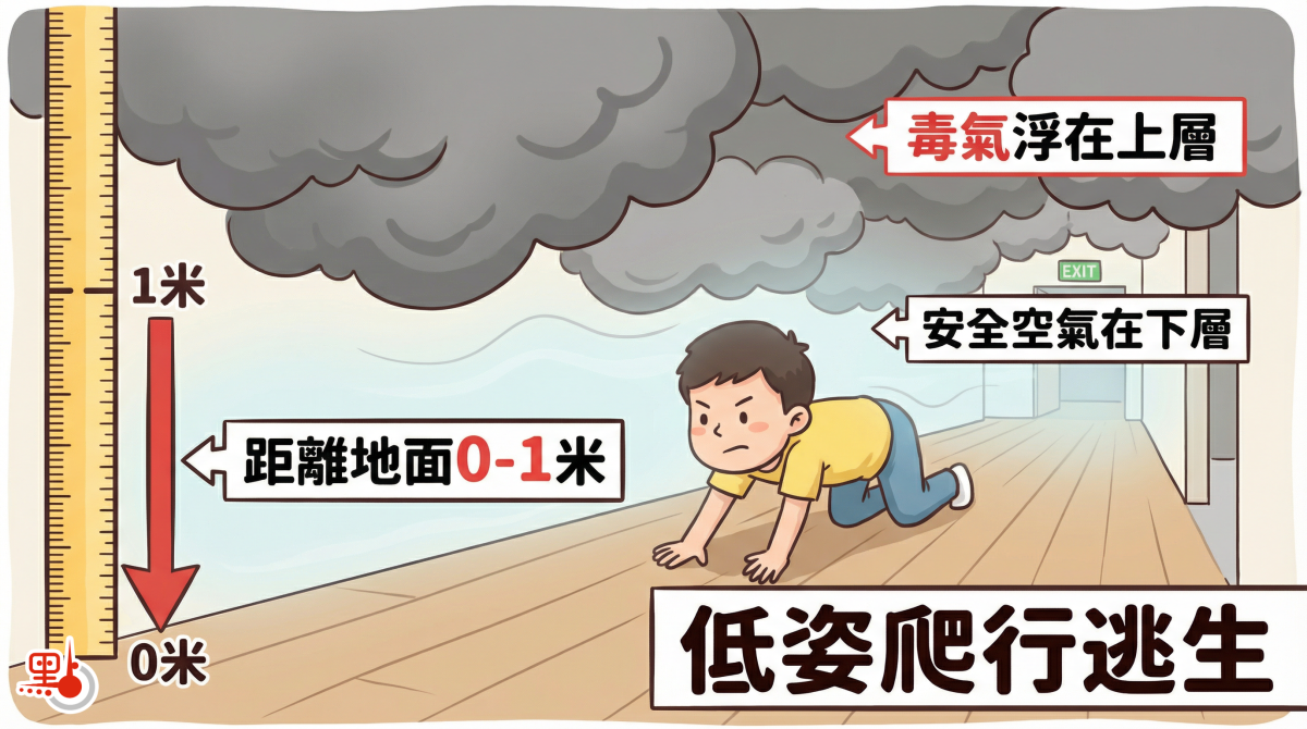 - ✅ 絕不使用電梯,低姿爬行逃生