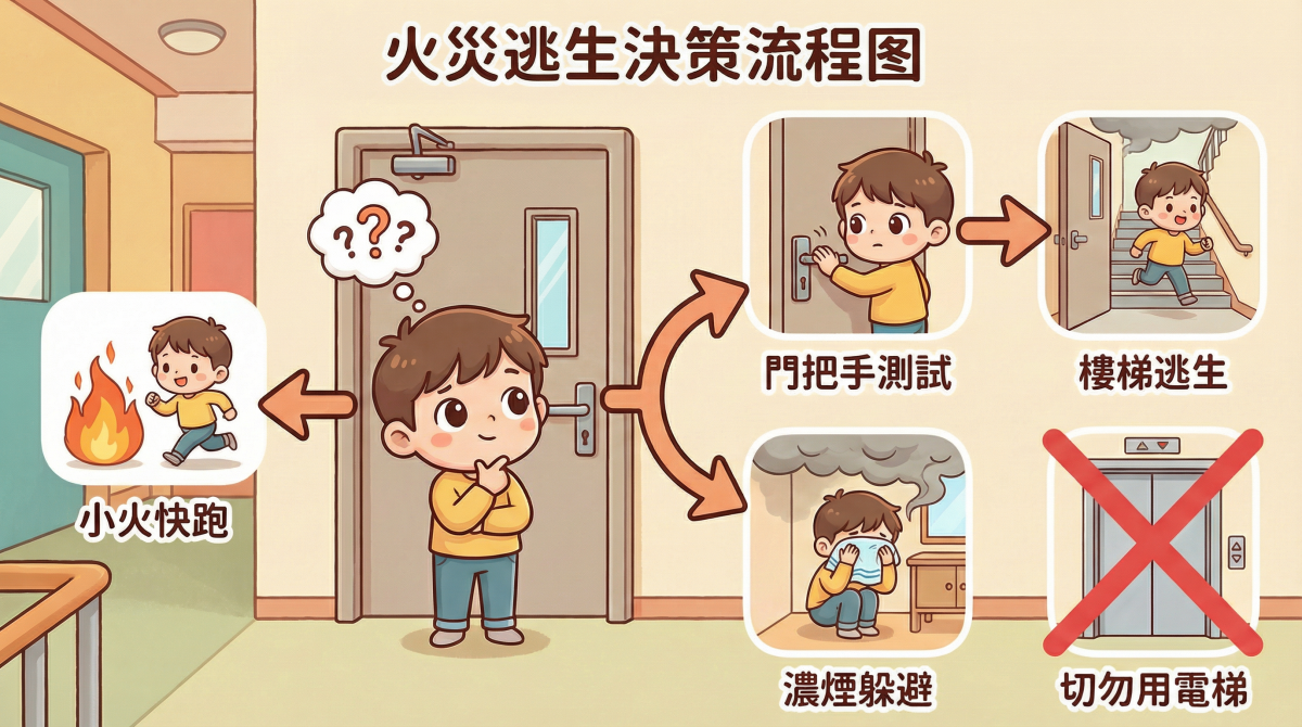 - ✅ 遇到火警,冷靜判斷:「小火快跑,濃煙躲避」