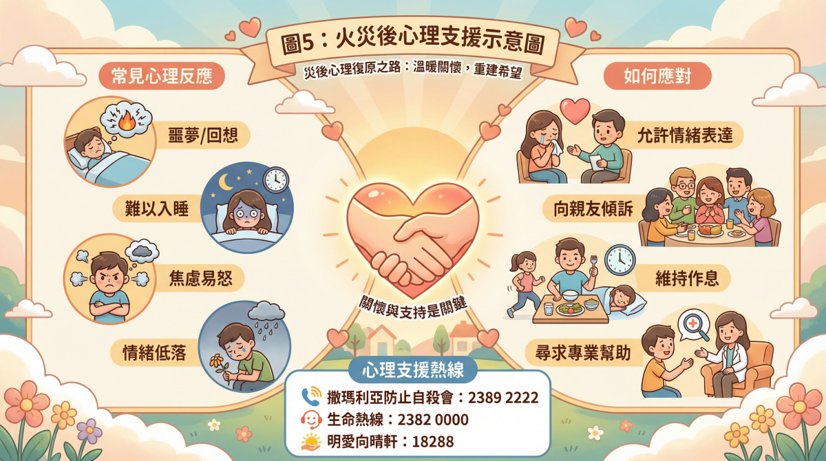 火災後心理支援示意圖。展示常見的PTSD症狀和應對方法,以及香港心理支援熱線。災後心理健康同樣重要,及時尋求專業幫助能有效緩解創傷。