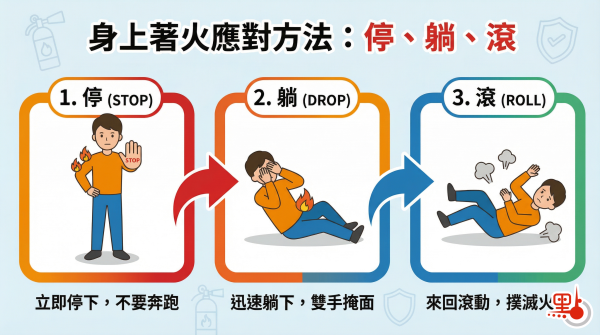 火災發生時,若身體局部小面積着火,可用手拍熄。要是四肢或身體大面積着火,則應謹記「停、躺、滾」口訣: