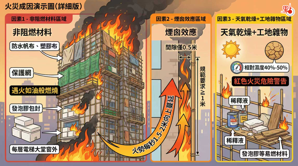外牆的保護網、防水帆布、塑膠布未使用阻燃材料,遇火後像油一樣燃燒。更糟的是,每層電梯大堂窗外都有發泡膠包封,遇熱極易蔓延。警方已拘捕三名承建商負責人,認為存在嚴重疏忽。