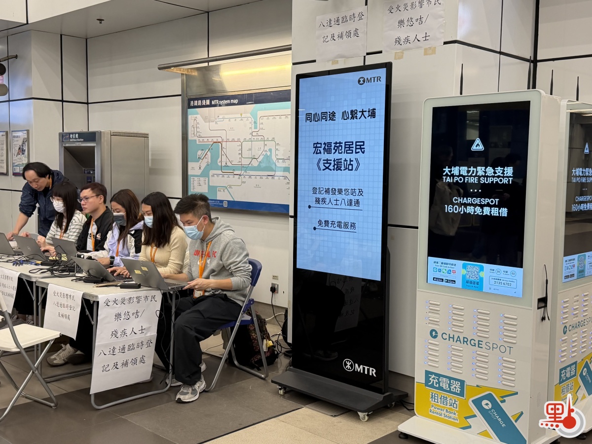 【點新聞報道】大埔宏福苑昨日(26日)發生五級火警,造成多人傷亡。至今,消防人員仍在進行滅火行動。地鐵大埔墟站已設置「受火災影響市民樂悠咭/殘疾人士八達通臨時登記及補貼領取處」,同時,該站點亦提供電力支援,包括提供免費充電服務及160小時免費租借充電寶。