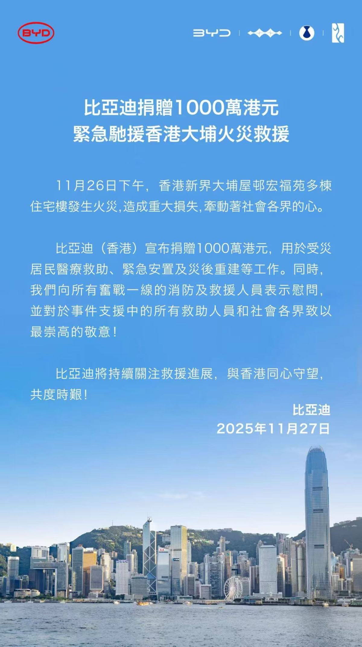 比亞迪表示,將持續關注救援進展,與香港同胞同心守望,共度時艱!