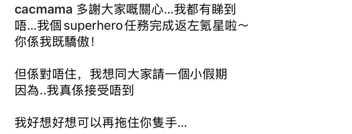 今日他的女友於社交平台發文悼念:「我個superhero任務完成返左氪星啦~你係我嘅驕傲!但係對唔住,我想同大家請一個小假期,因為我真係接受唔到,我好想好想可以再拖住你隻手…」。