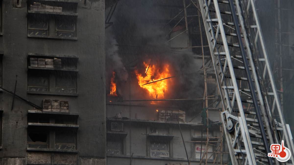 點新聞記者在現場看到,大約在下午5時15分,宏新閣中層單位突然有碩大火舌噴出,愈燃愈烈,水槍已進行集中救噴射;約5時20分,原本一直在冒煙的宏泰閣高層,突然有火舌噴出;約5時24分,宏泰閣再出現一處明顯有火舌噴出的位置,此方位早前有黑色濃煙不斷向外飄出;隨後,宏建閣亦再出現火舌。有消防員在現場搜救。