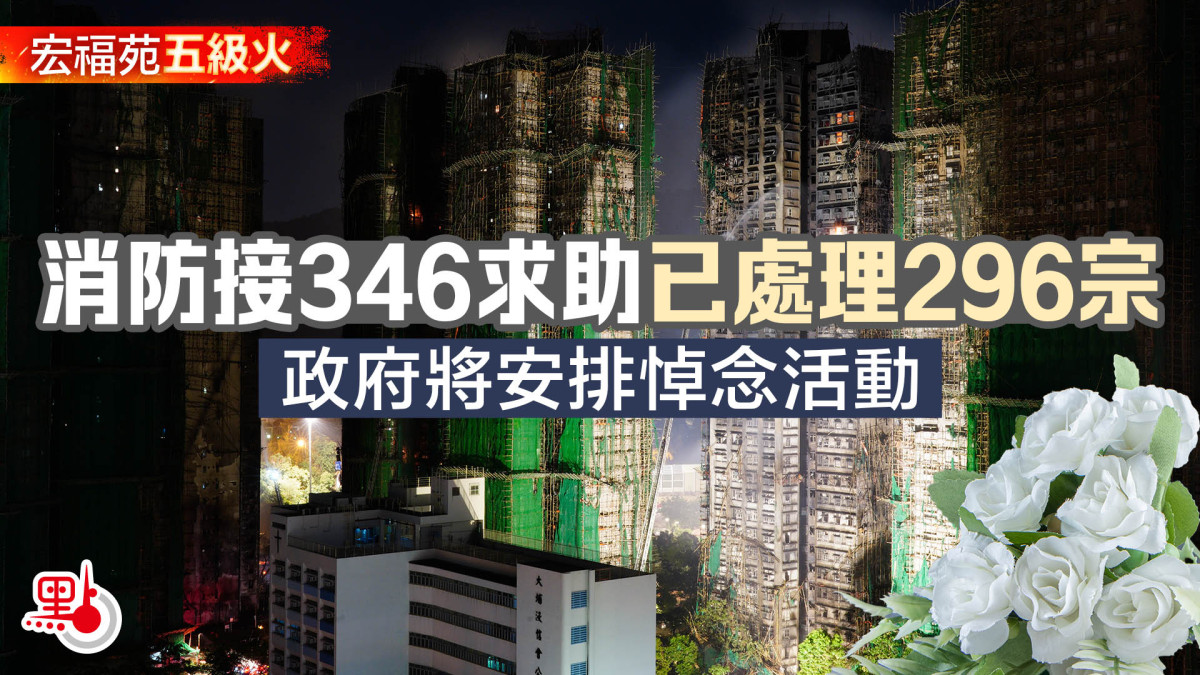 就救援方面,宏福苑8座樓宇中,7座受影響樓宇的火勢大致受控。消防處現正繼續全力完成剩餘樓層的搜救與滅火工作。火警期間,消防處共接獲346宗求助個案,已處理其中296宗個案。