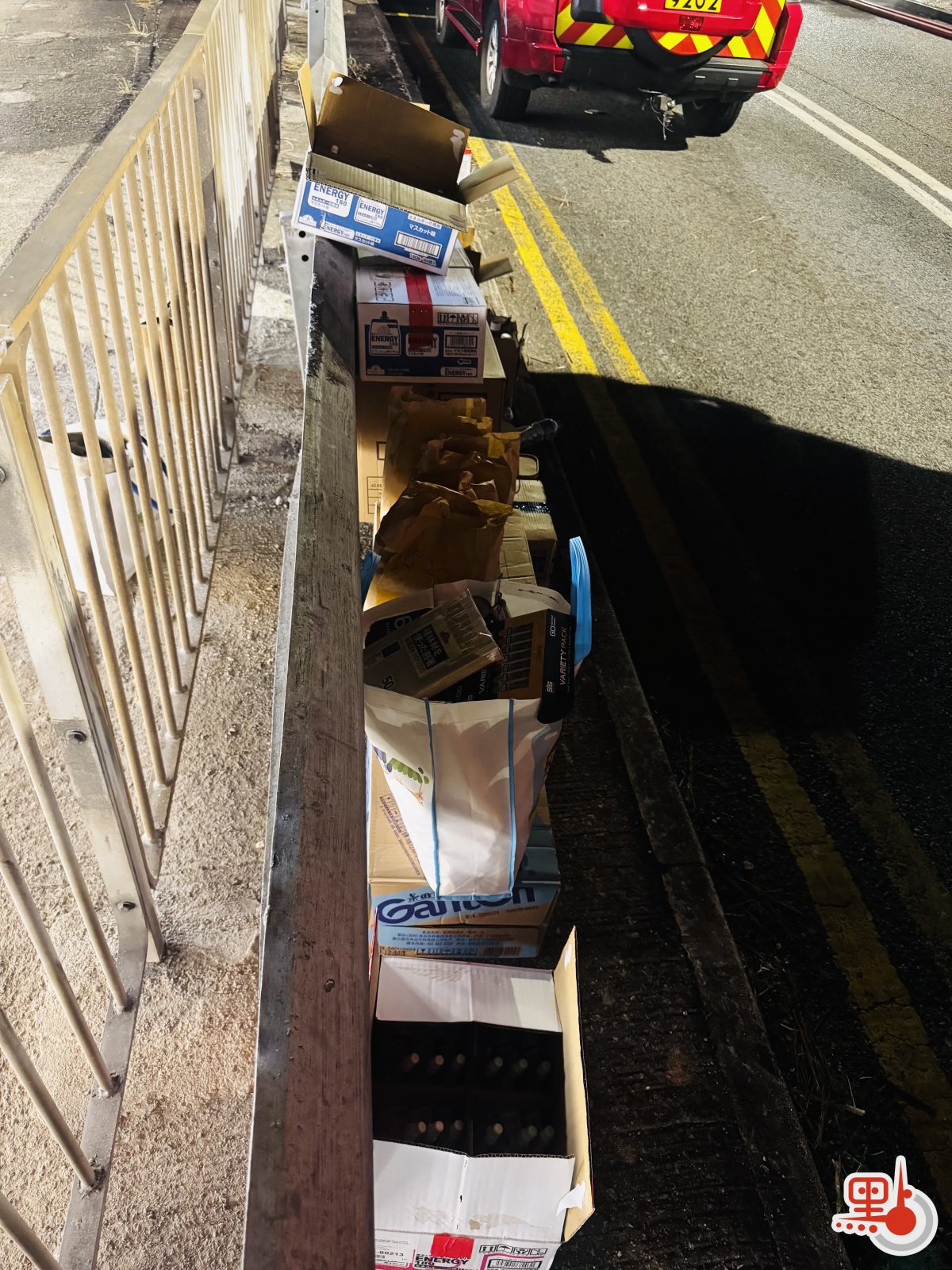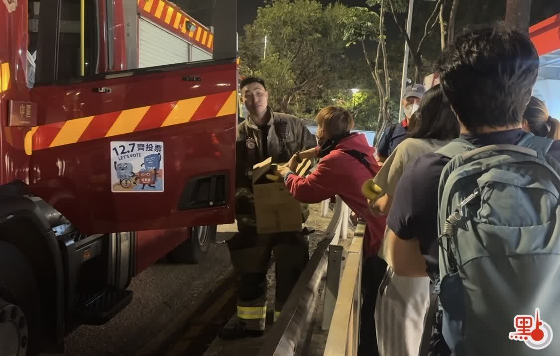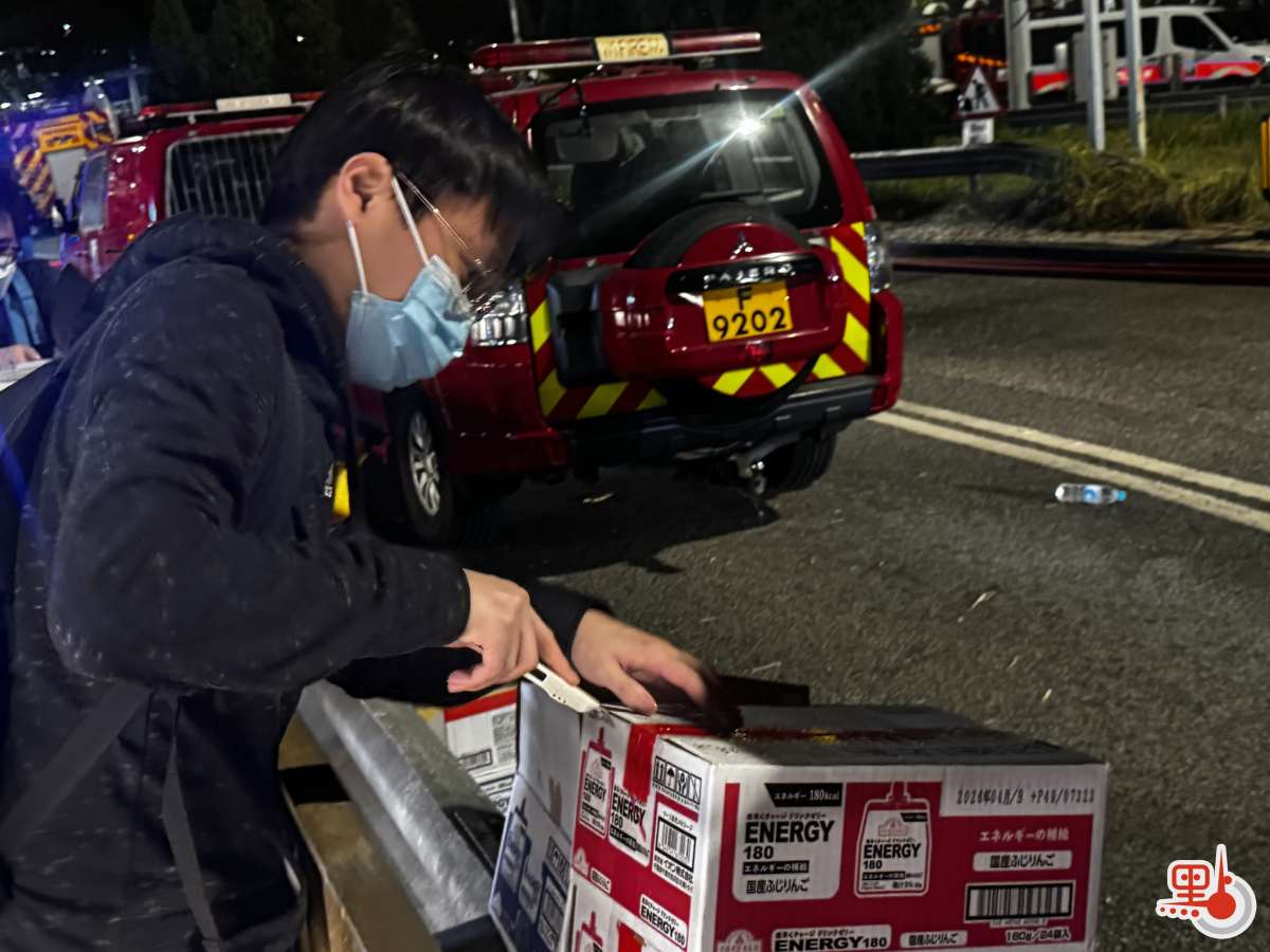 「真的不用這麼多,多謝你哋!」消防隊員看着堆成小山的物資連連道謝,同時建議可將部分物資留置路邊,供後續輪替的同仁取用。大家隨即將成箱礦泉水、能量棒、麥當勞餐點及乾淨餐具整齊排列在路旁,形成一個臨時補給站。