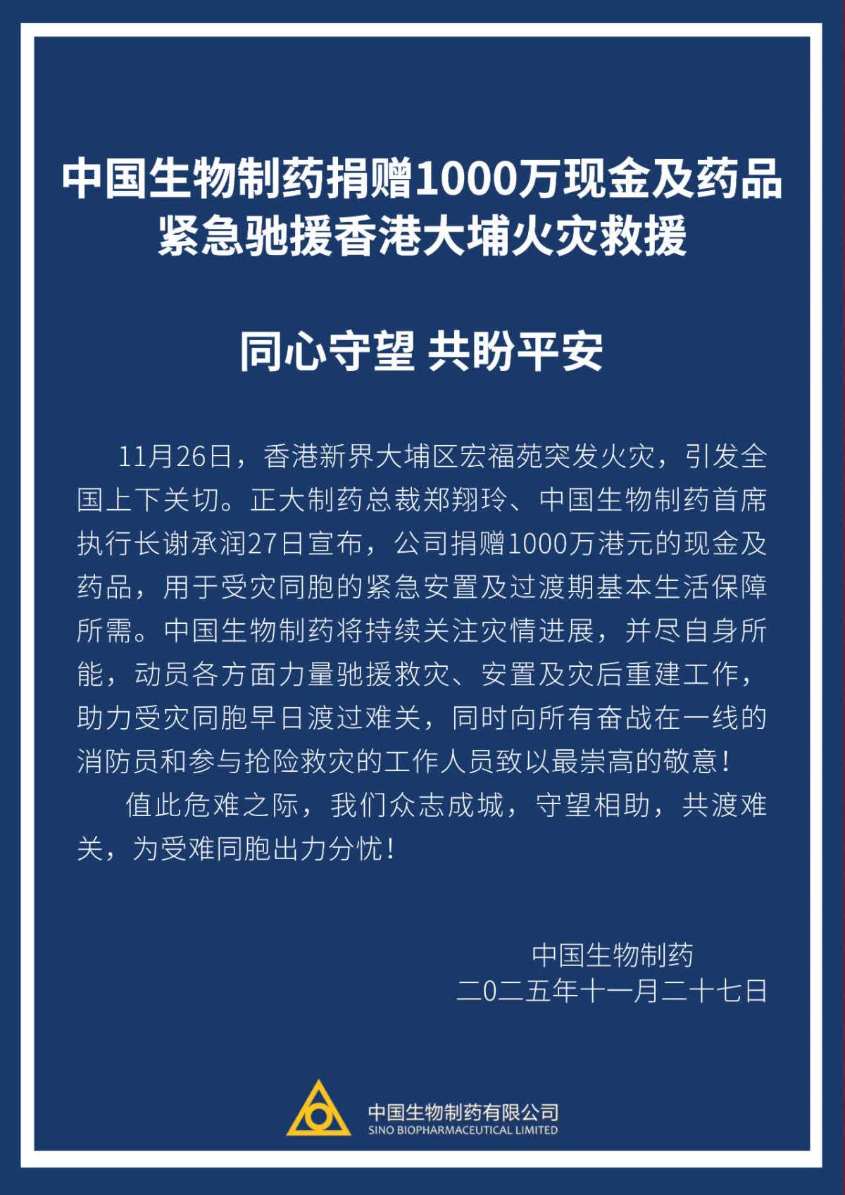【點新聞報道】11月26日,香港新界大埔區宏福苑突發火災,引發全國上下關切。正大製藥總裁鄭翔玲、中國生物製藥首席執行長謝承潤27日宣布,公司捐贈1000萬港元的現金及藥品,用於受災同胞的緊急安置及過渡期基本生活保障所需。