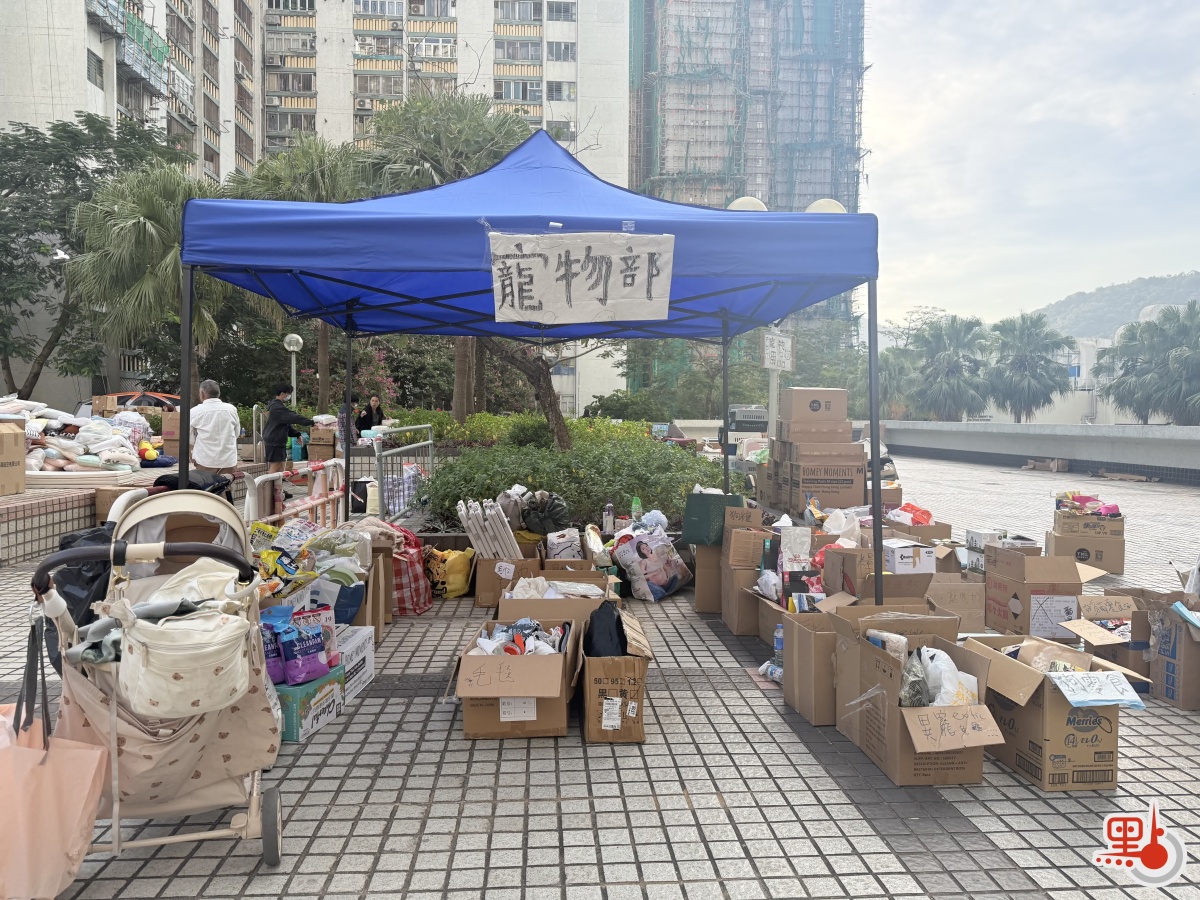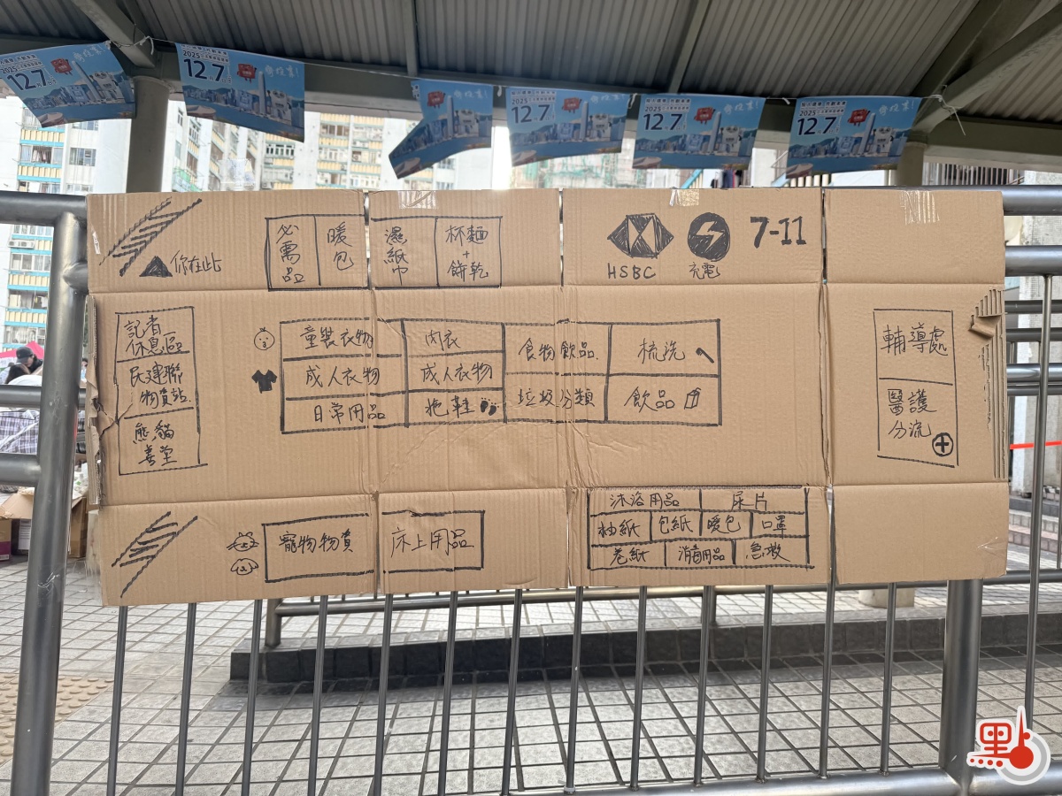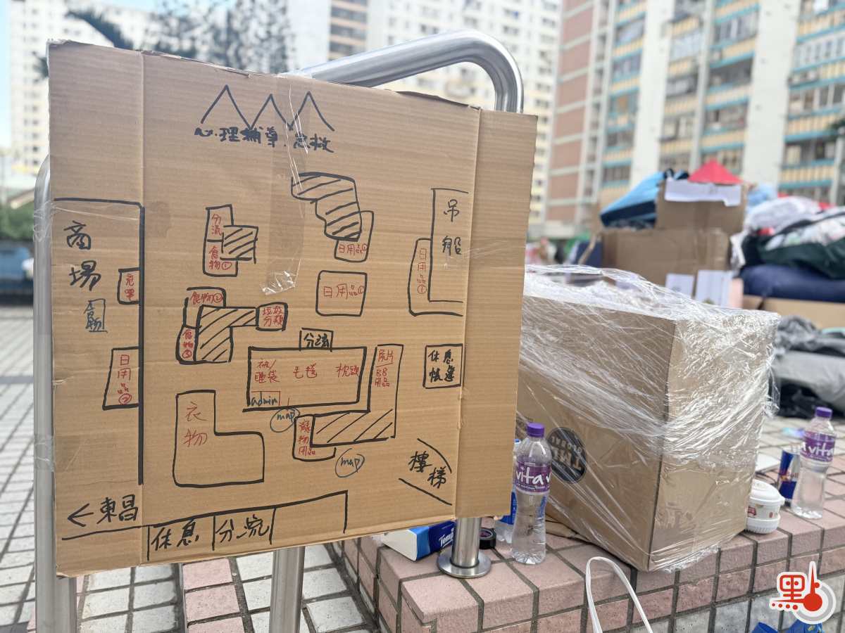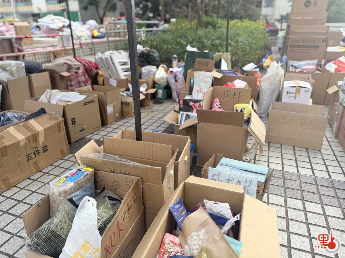 另外,今早8時許,廣福天台已有義工陸續到場為街坊派發物資,除常見的衣物與食物外,今日亦見到有寵物部,提供狗糧、貓糧及寵物零食等用品。現場亦貼有市民自行繪製的紙板指示牌,標明各類物資的分配區、記者休息室、充電區等位置。