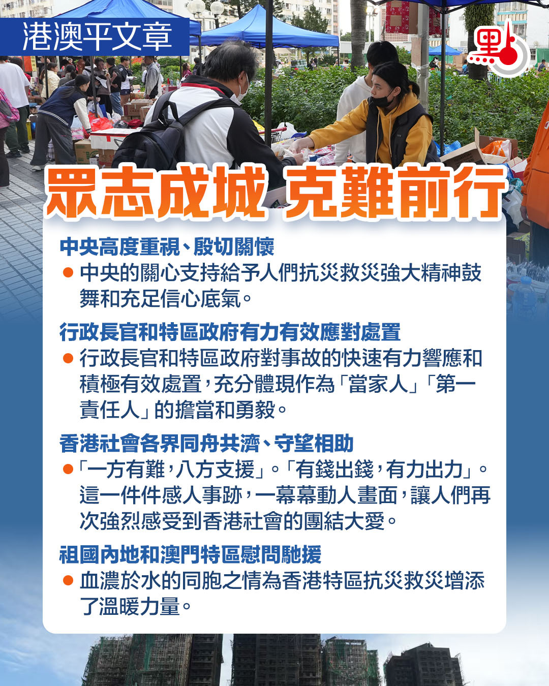 眾志成城,必能克難前行。有中央政府和祖國內地的強大後盾,香港特區政府帶領社會各界發揚獅子山精神,團結一致、排除干擾、齊心協力,一定能夠做好救災工作,渡過難關、邁步向前!