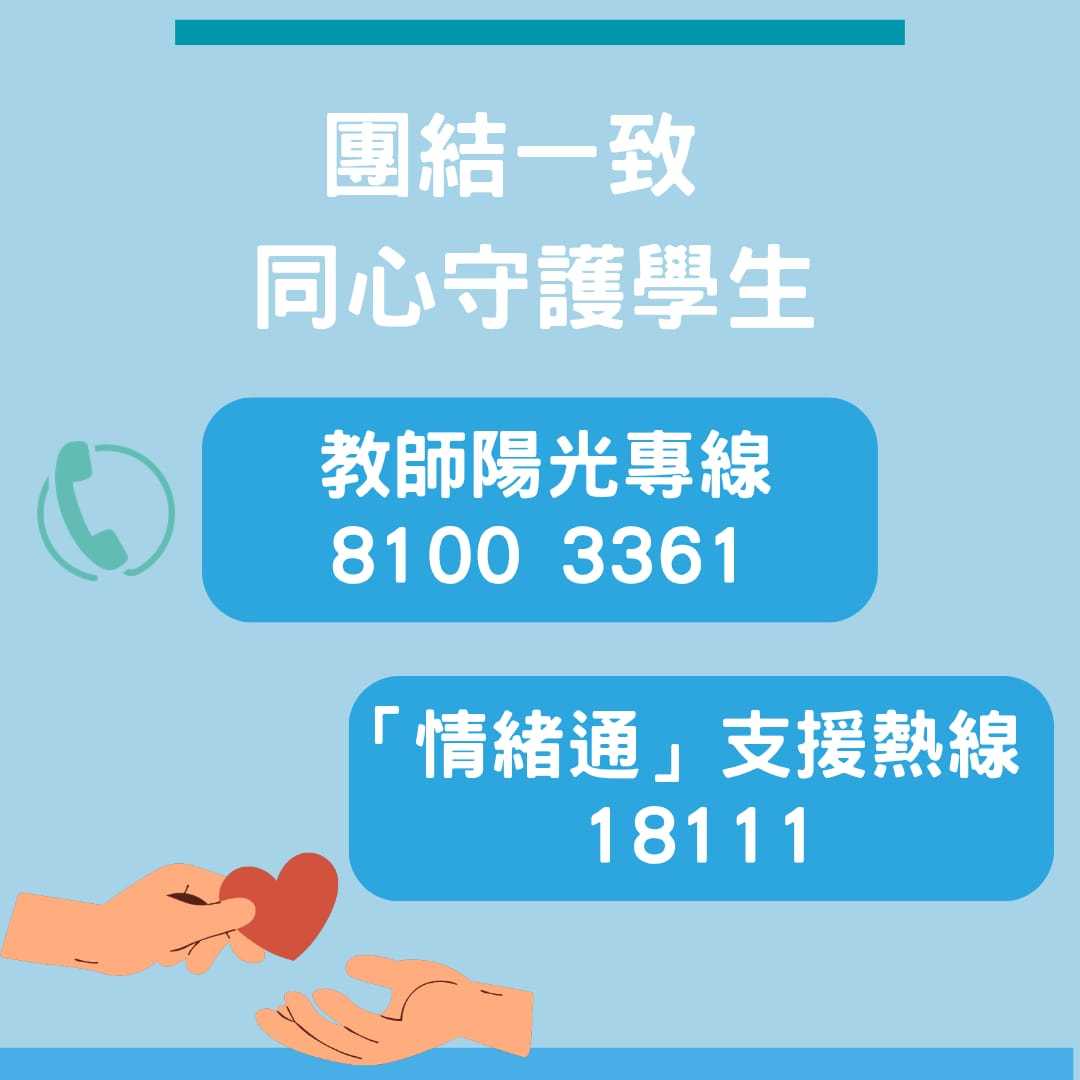 此外,教育局也已聯絡「教師陽光專線」(電話:8100 3361)的輔導員,加強為受影響的教師和校長提供電話輔導及支援,聆聽教師心聲。