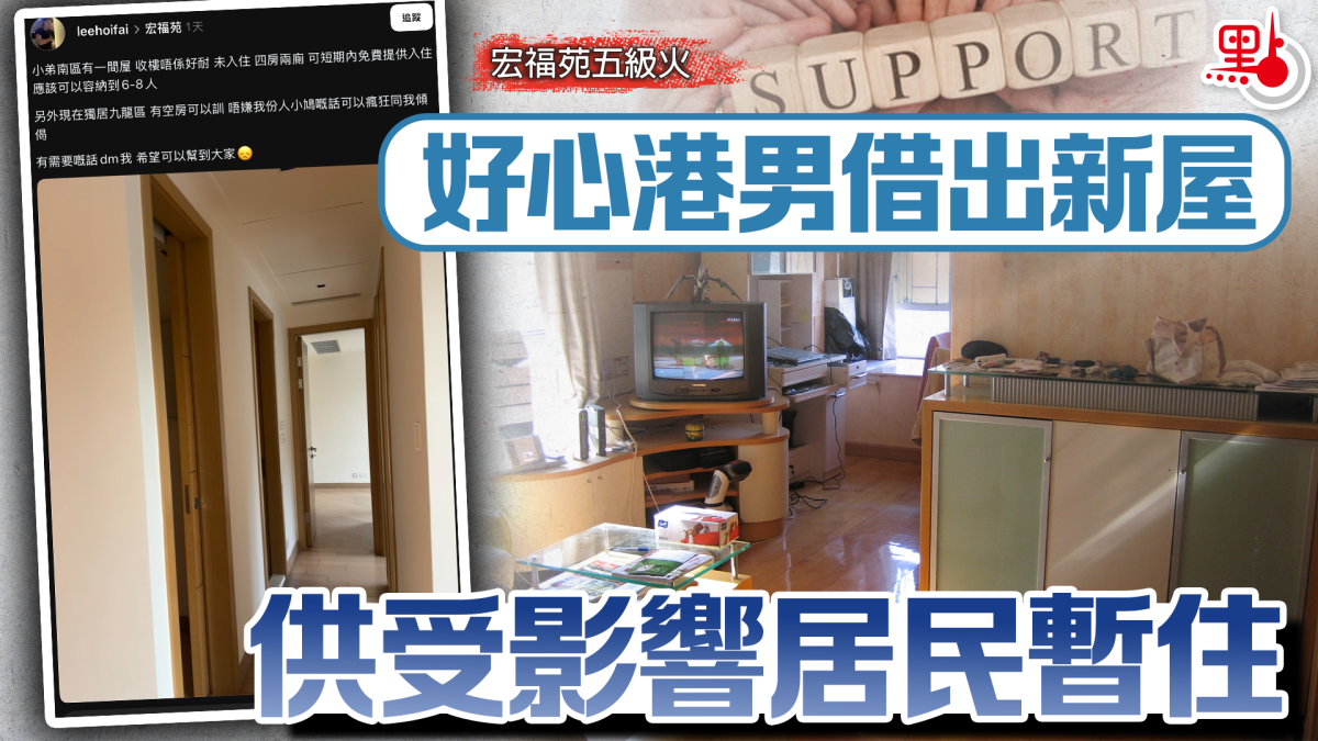 樓主在社交平台發帖,指自己在南區有收樓不久的單位,尚未入住,有4房2廁應可容納6至8人,並表示自己目前獨居於九龍區,尚有空房讓有需要的宏福苑居民暫住「唔嫌我份人小X嘅話可以瘋狂同我傾偈,有需要嘅話dm我,希望可以幫到大家」。樓主還補充:「非受影響居民非誠勿擾,能力有限未必可以滿足到各位所需嘅要求,只能提供短期住所服務」。
