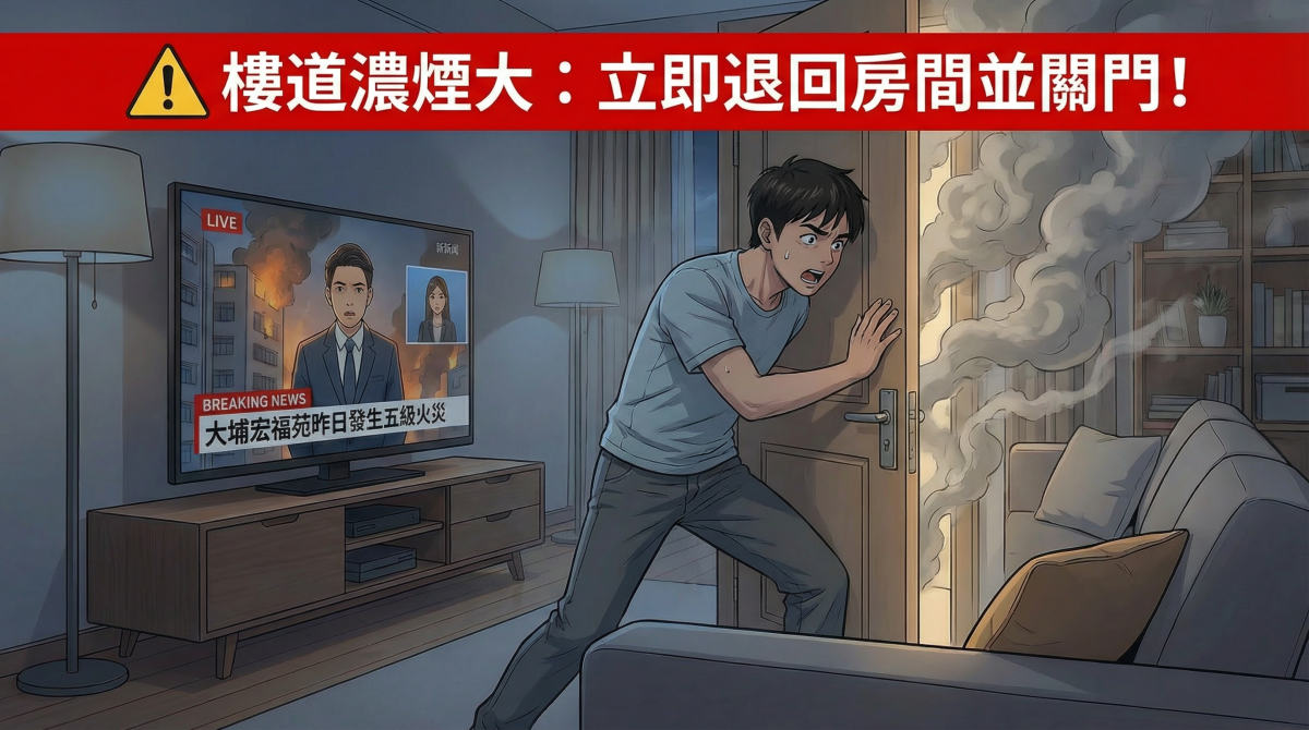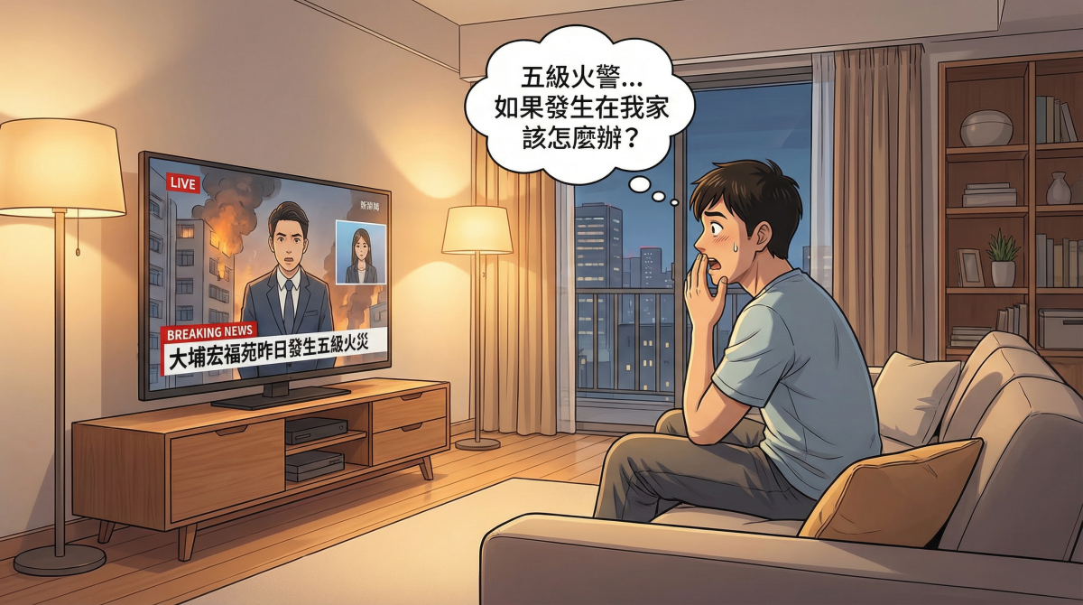 圖:阿明看電視新聞,震驚於宏福苑五級火災報導