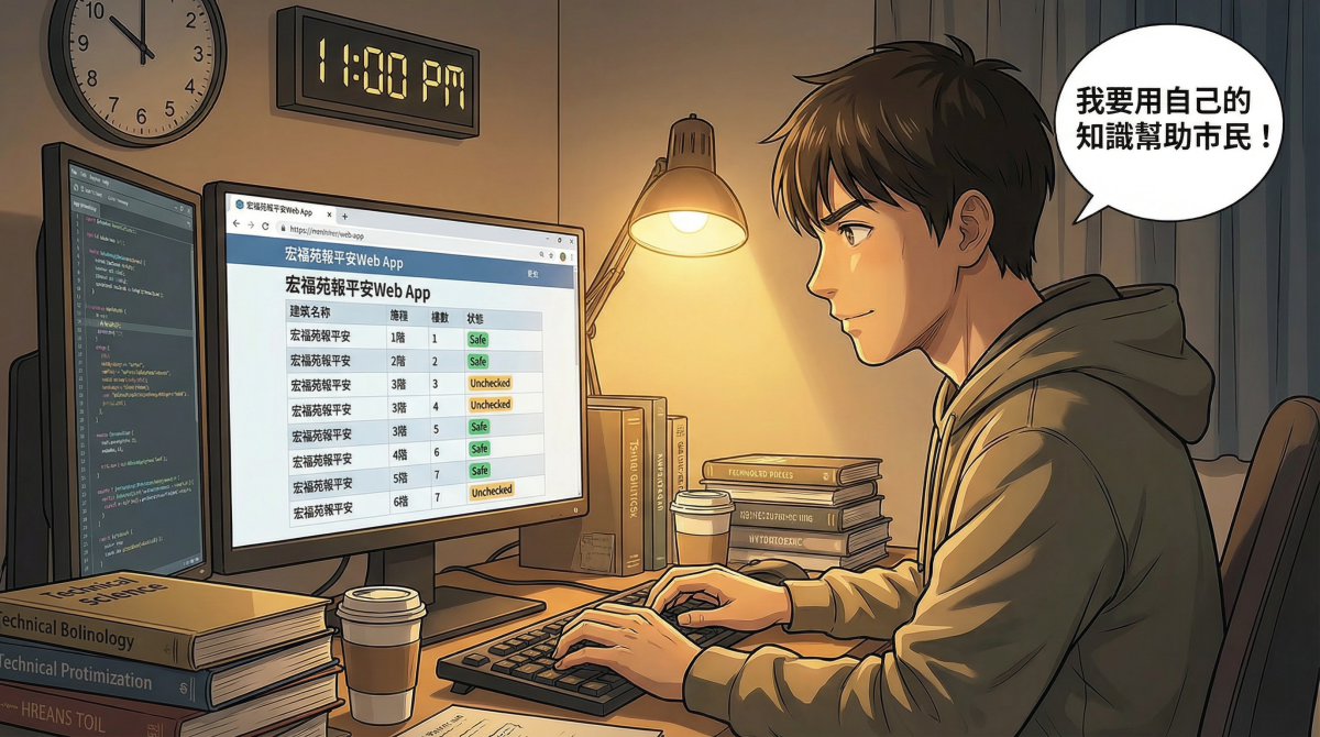 圖:31歲港男工程師在深夜用AI開發「宏福苑報平安Web App」,電腦螢幕顯示網站介面