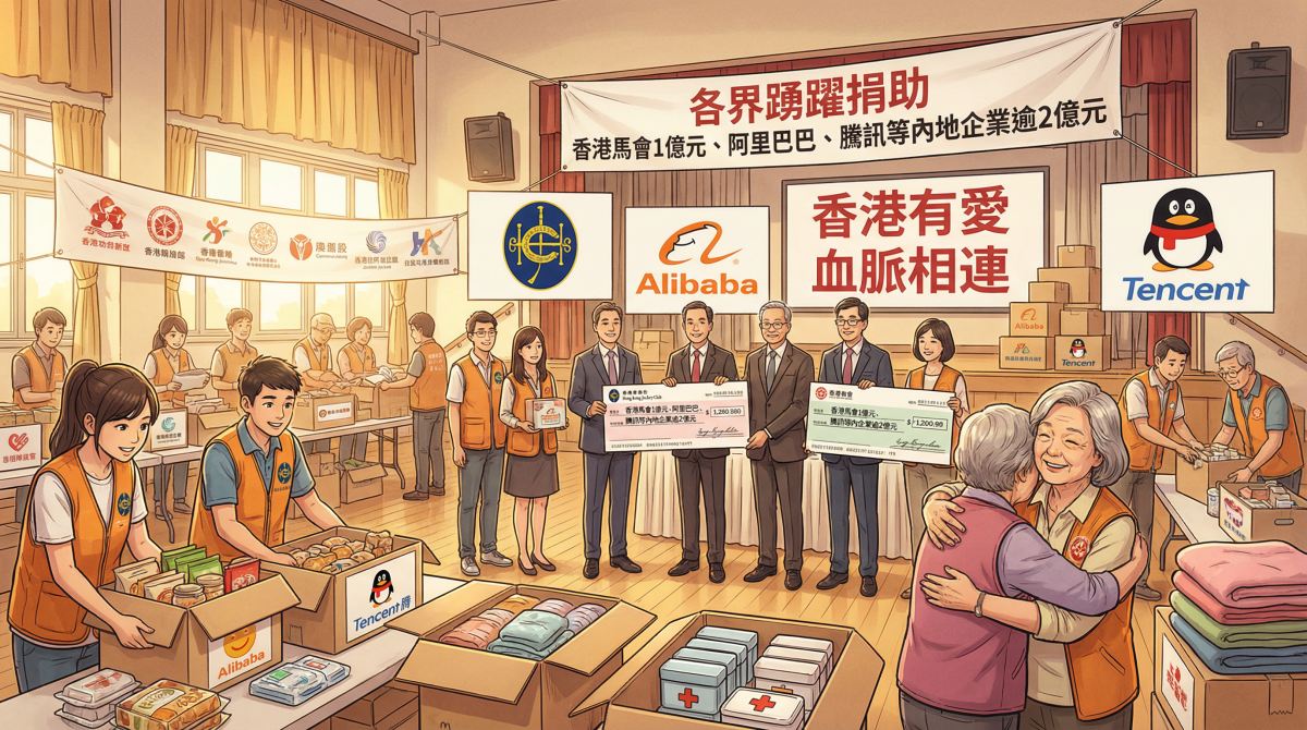 圖:各界踴躍捐助現場,香港馬會、內地企業、社團商會等代表送上捐款和物資