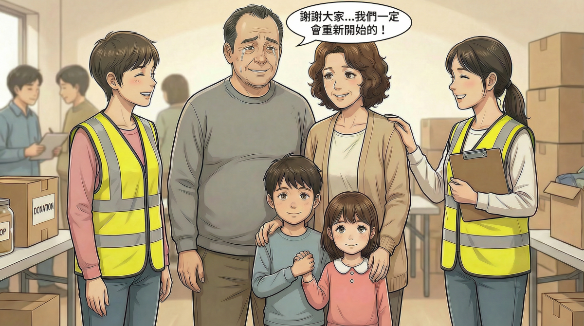 圖:志願者搬運物資,社福機構人員提供心理輔導