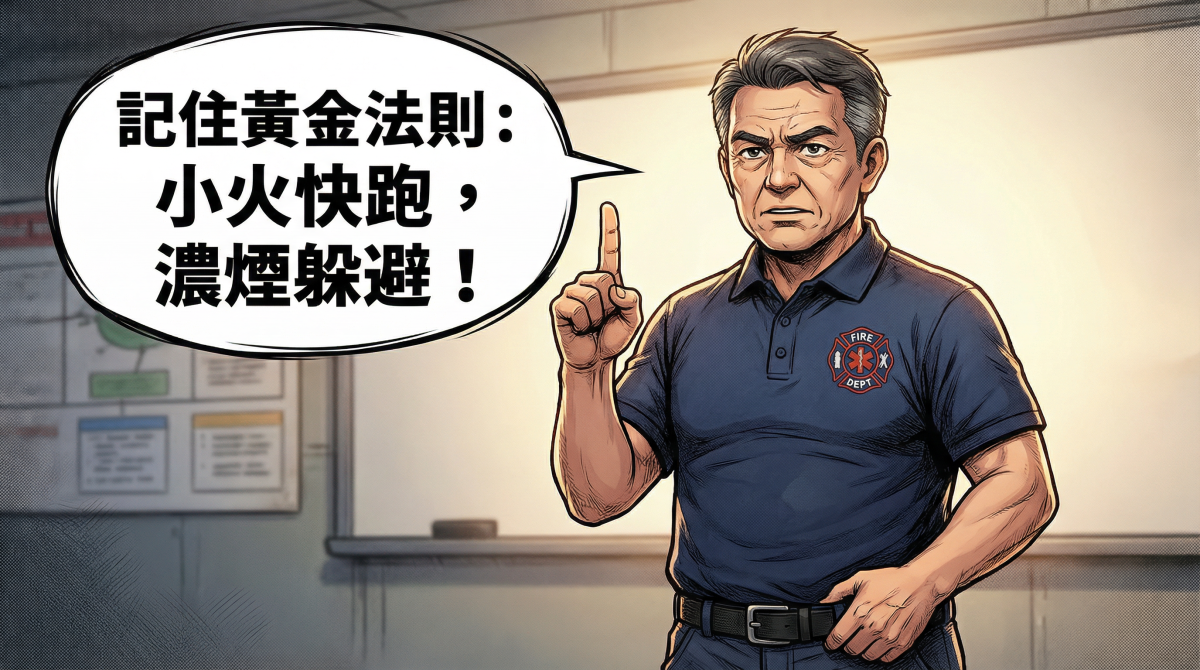 圖:消防員叔叔舉起三個手指,強調逃生三寶