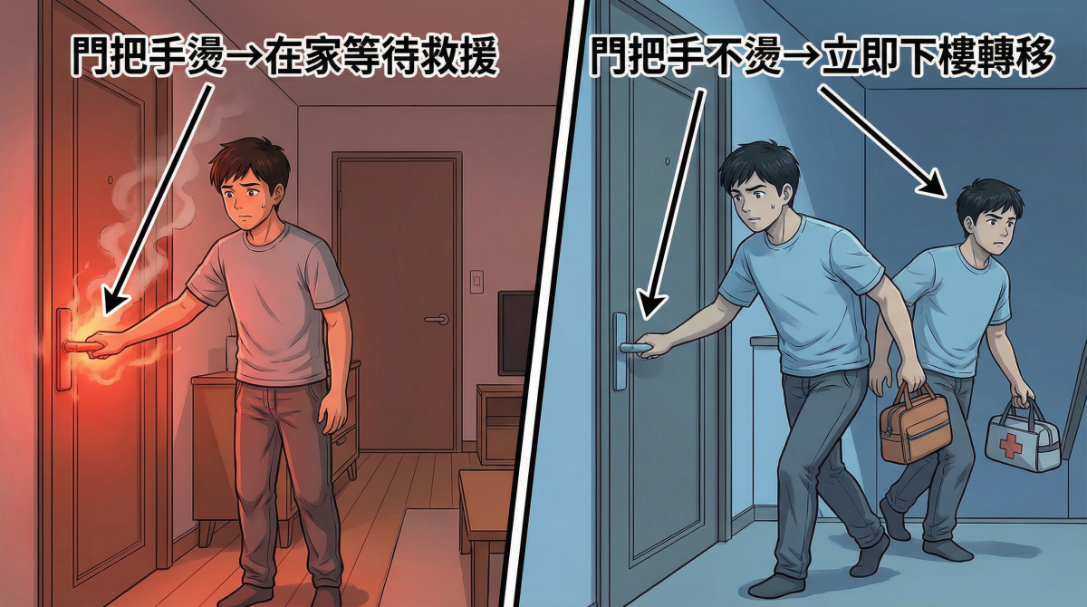 圖:左側:門把手發燙(紅色),阿明留在家中;右側:門把手不燙,阿明準備下樓