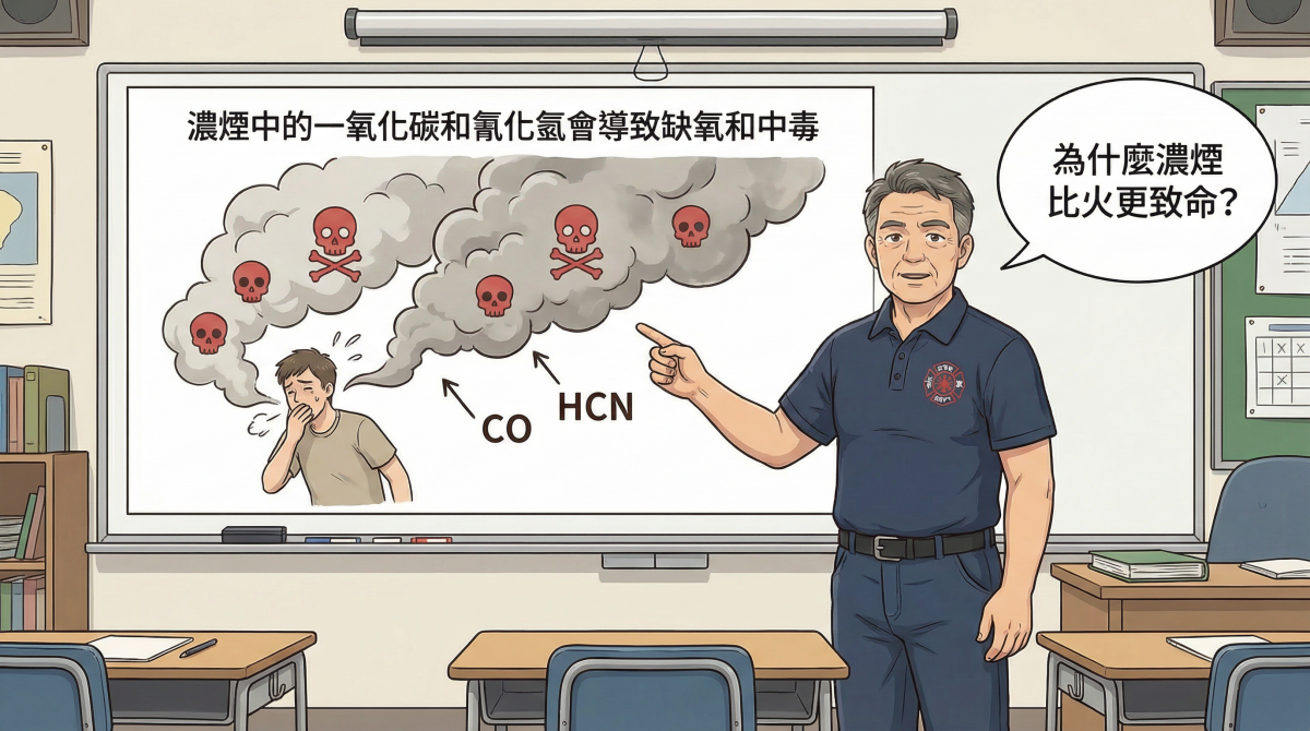 圖:消防員叔叔指着示意圖,展示濃煙危害