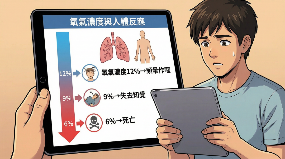 圖:阿明跪在地上爬行逃生,上方有煙霧。標注0-1米安全空氣層