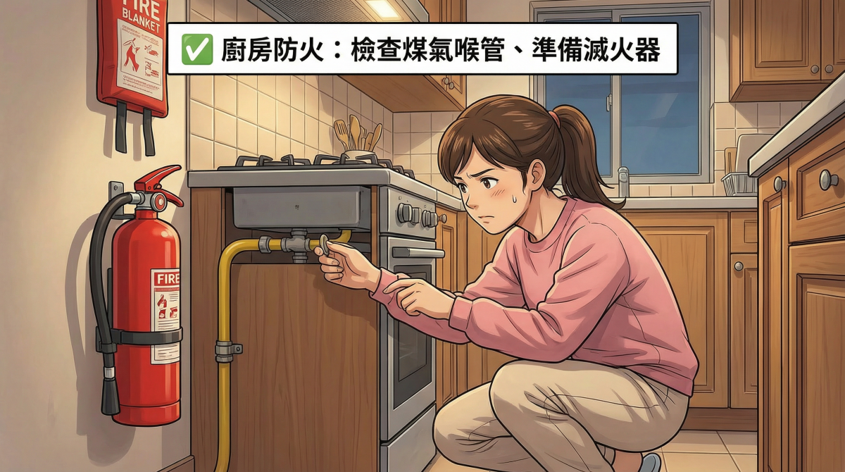 圖:阿琳檢查煤氣喉管,旁邊有滅火器