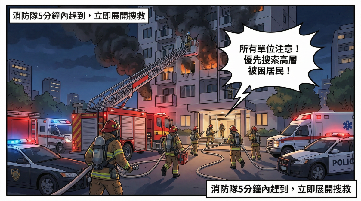 圖:消防車趕到現場,消防員衝入大廈搜救被困人員