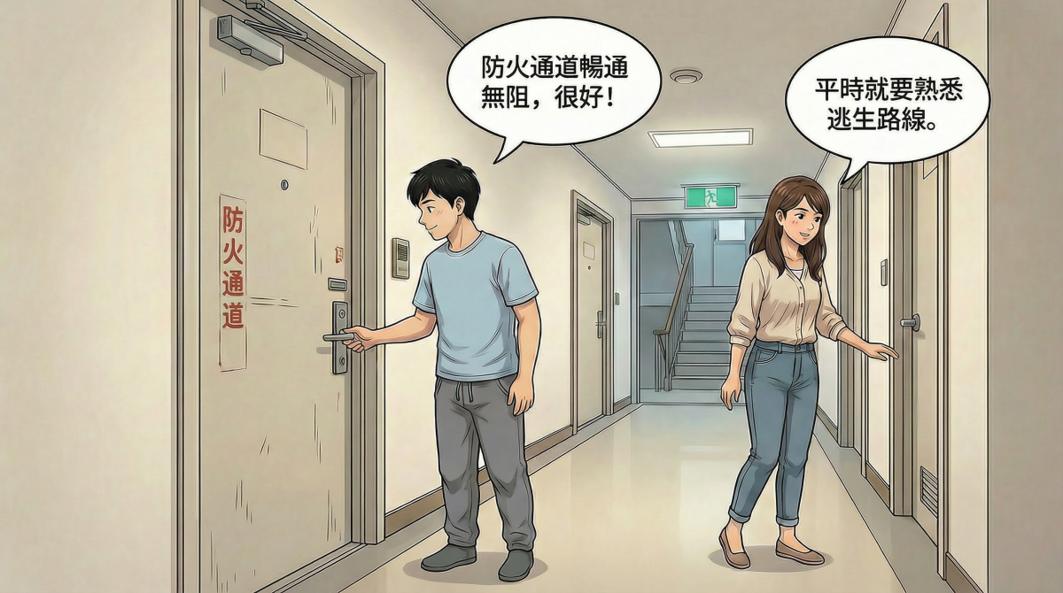 圖:阿明沿樓梯向下逃生,樓道無煙