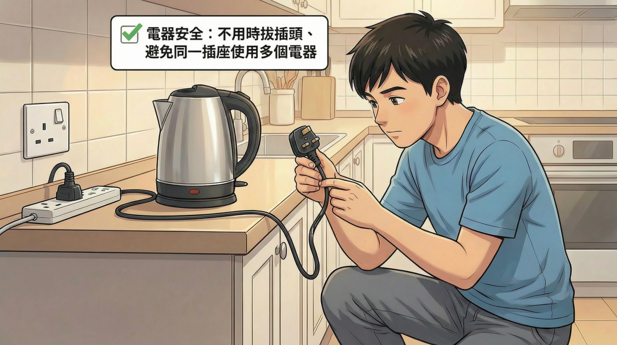 圖:阿明拔掉電熱水壺插頭,檢查電線