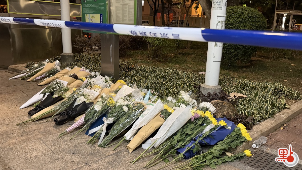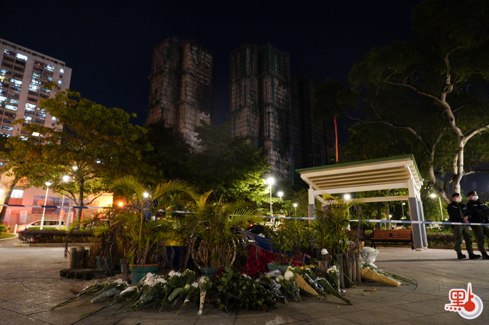 有市民逗留在火災現場附近,遠遠注視着宏富苑。有人低頭默哀,還有人將鮮花擺放在路旁。